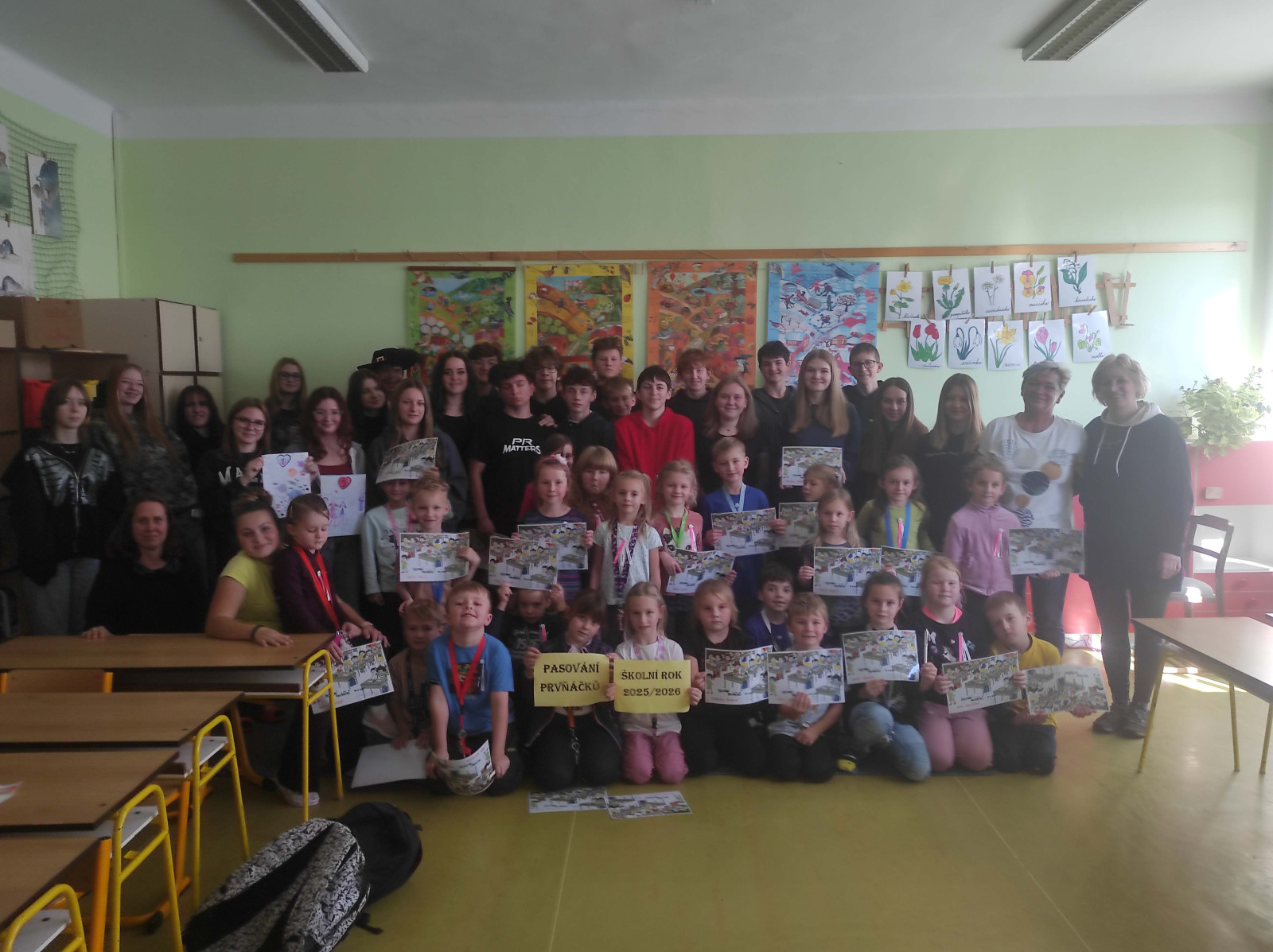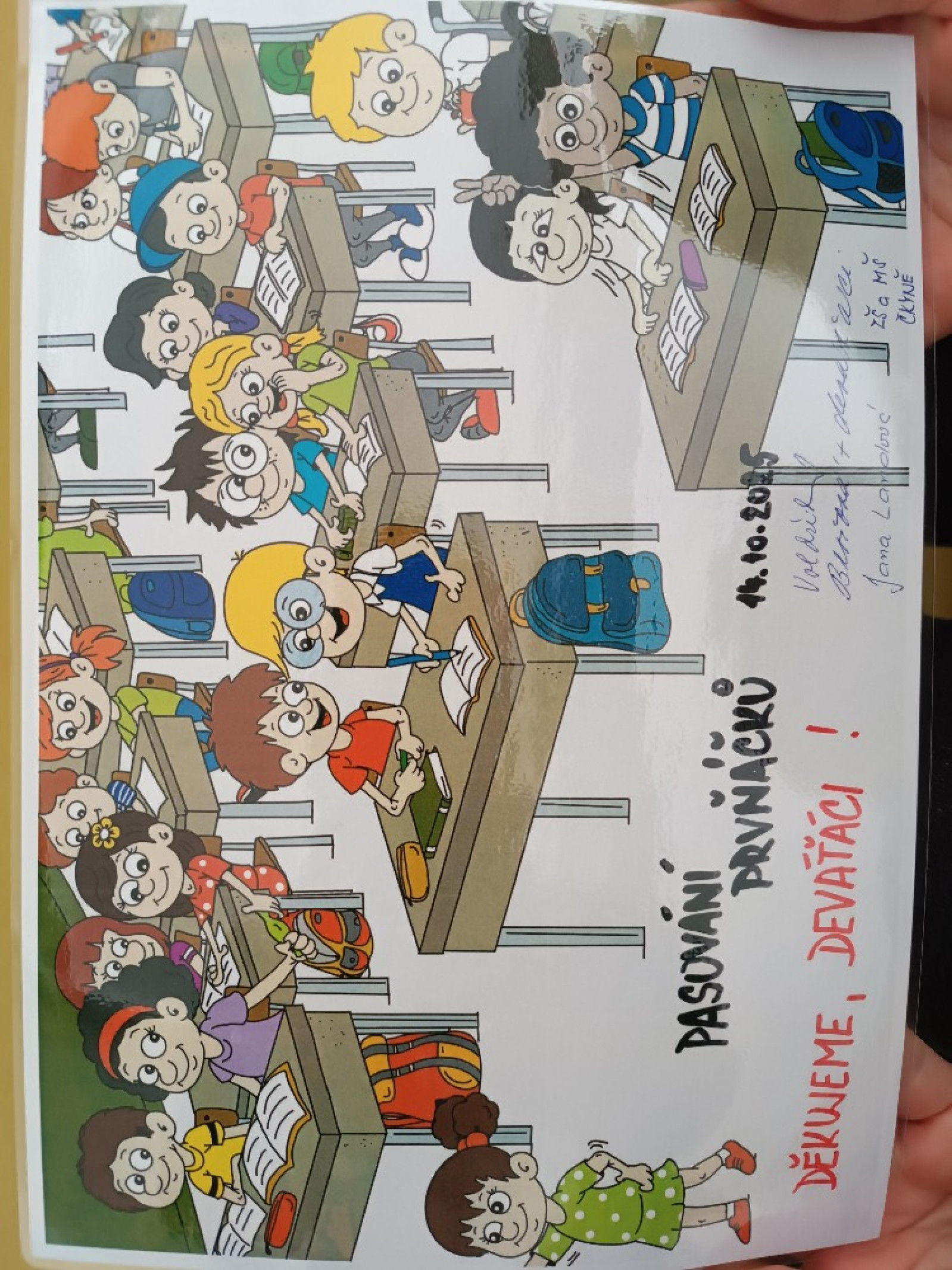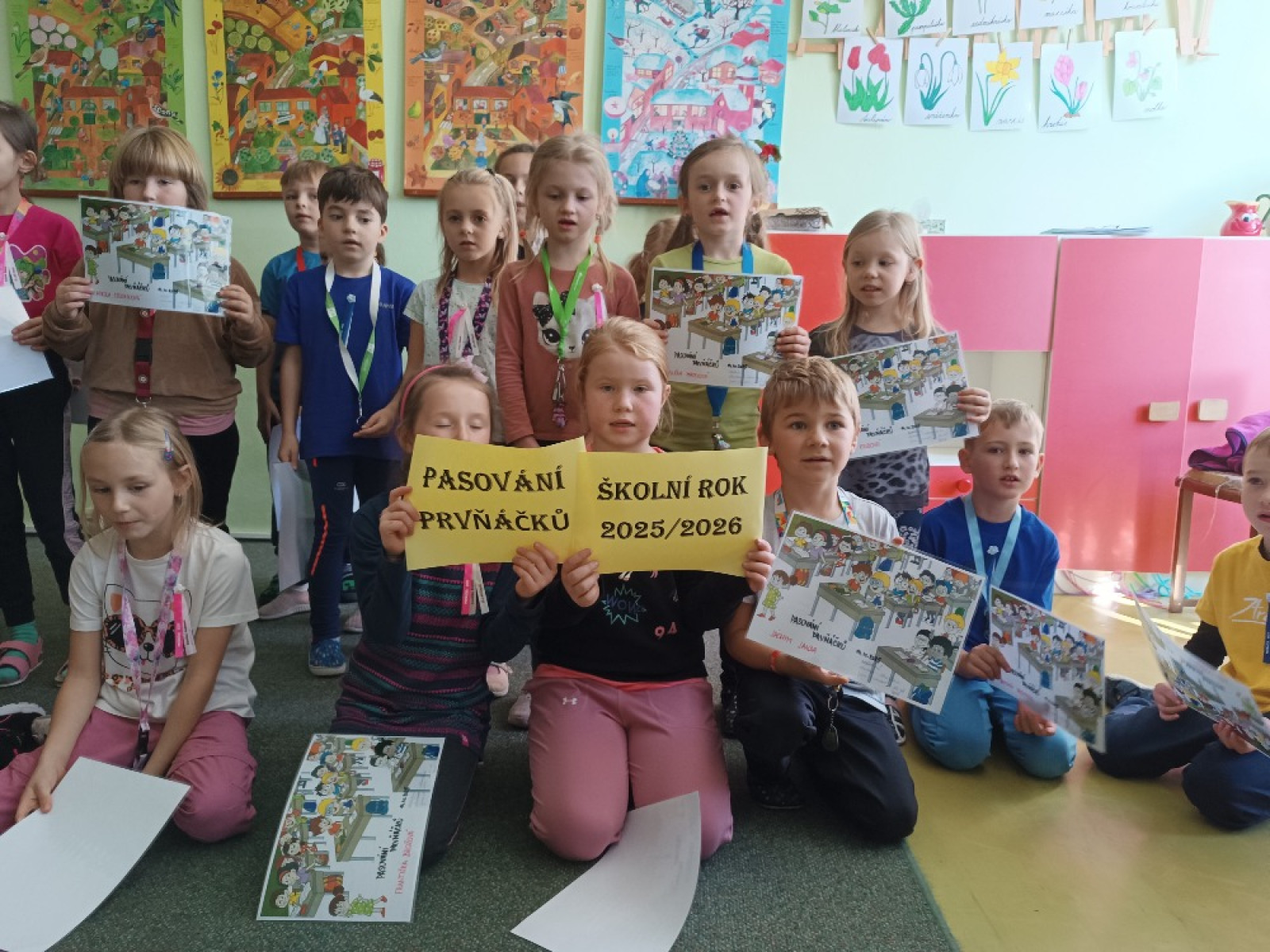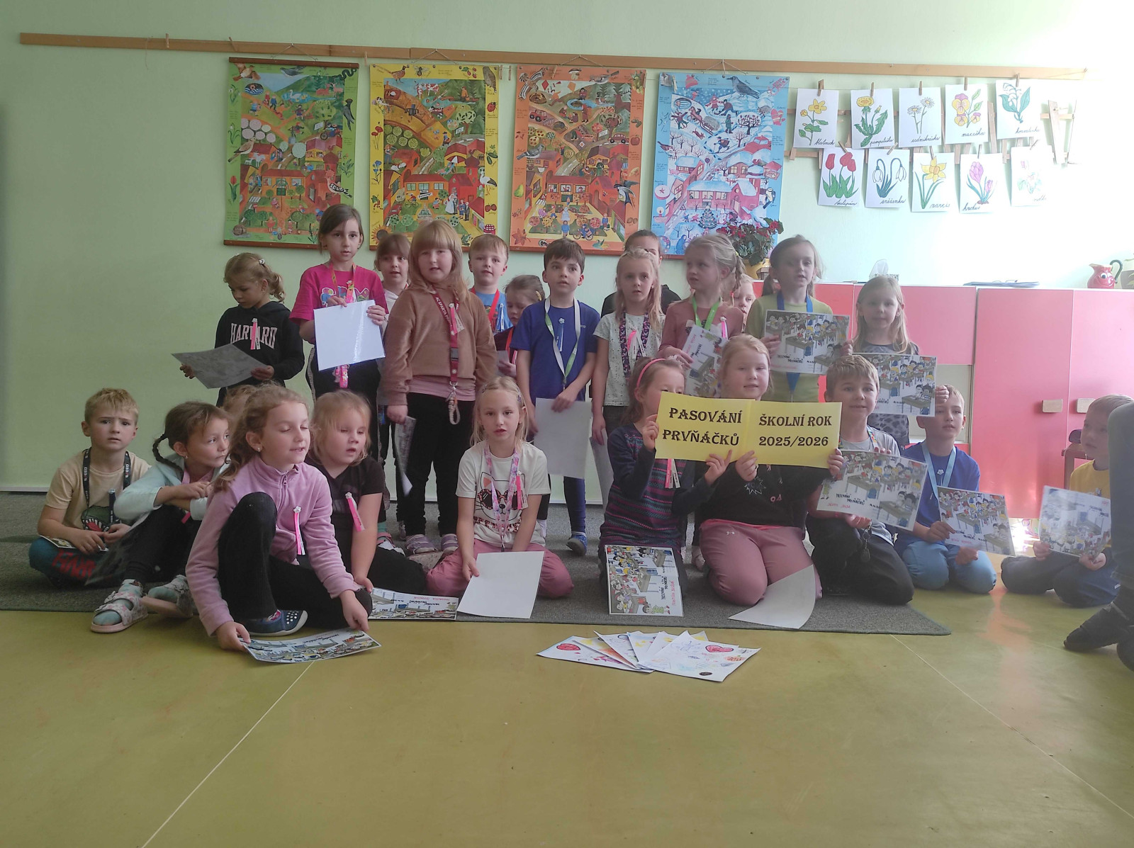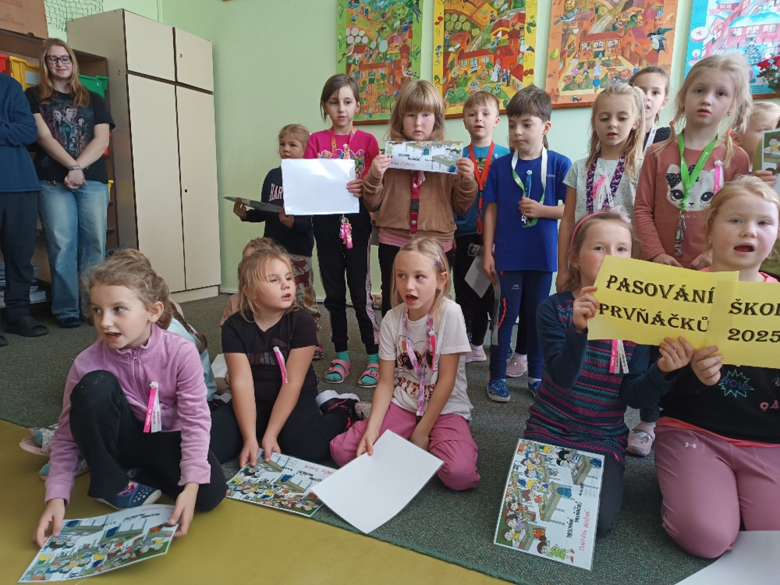 Dnešek byl pro nás prvňáky velmi důležitý. Stali jsme se totiž těmi pravými školáky. Přišli za námi ostřílení deváťáci a připravili si pro nás různé herní aktivity. Na označených stanovištích v celém areálu školy jsme pod jejich vedením plnili zajímavé úkoly. Museli jsme po hmatu poznávat některé školní pomůcky, trefovali jsme se míčky do lahvových terčů, skákali jsme od mety k metě v pytlích, skládali jsme puzzle na rychlost, svou zručnost jsme si vyzkoušeli ve štafetovém běhu s míčkem na lžíci. Ještě než jsme do soutěží vyrazili, paní učitelka nás chtěla potrápit skládáním slov ze slabik, které jsme museli pokládat na stopy. Ty byly rozházené po koberci v družině. Jenže na nás si nepřišla, my totiž skládání slov hodně trénujeme v hodinách ČJ. To horší bylo házet provazovými kroužky na kříž s očíslovanými terči a sčítaly se nám body za zásah. To si s námi vyzkoušeli i deváťáci a nebylo to jednoduché ani pro ně, protože ti museli házet z větší vzdálenosti. A tak nám celé veselé dopoledne uteklo, ani nevíme jak. Na závěr nám naši starší parťáci udělali bránu ze svých rukou, předali nám stužky a pamětní listy a dvorní rytíř od krále Oty Prvního nás slavnostně pasoval na školáky prvňáky. Král Ota První nás bude provázet Živou abecedou a hlavně Slabikářem po celý školní rok. Už nám napsal několik dopisů a my se pilně učíme písmena, která nám v učebnici připravuje. Museli jsme naše starší kamarády také něčím obdarovat a potěšit, a tak jsme jim jako poděkování namalovali obrázky a zazpívali jim písničku o tom, jak jsme se rozloučili se školkou a hrdě se stali školáky prvňáky.