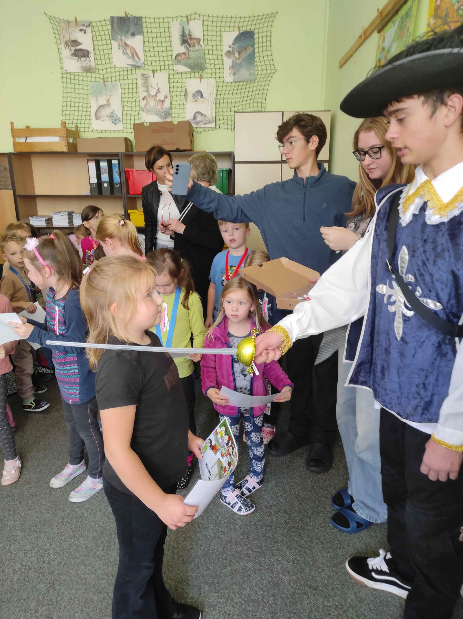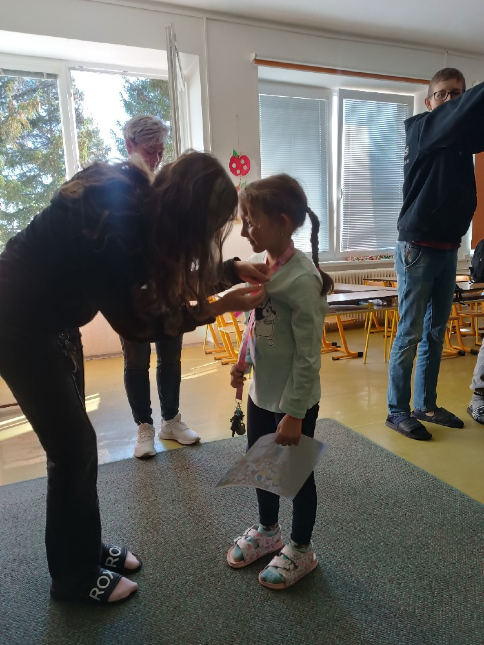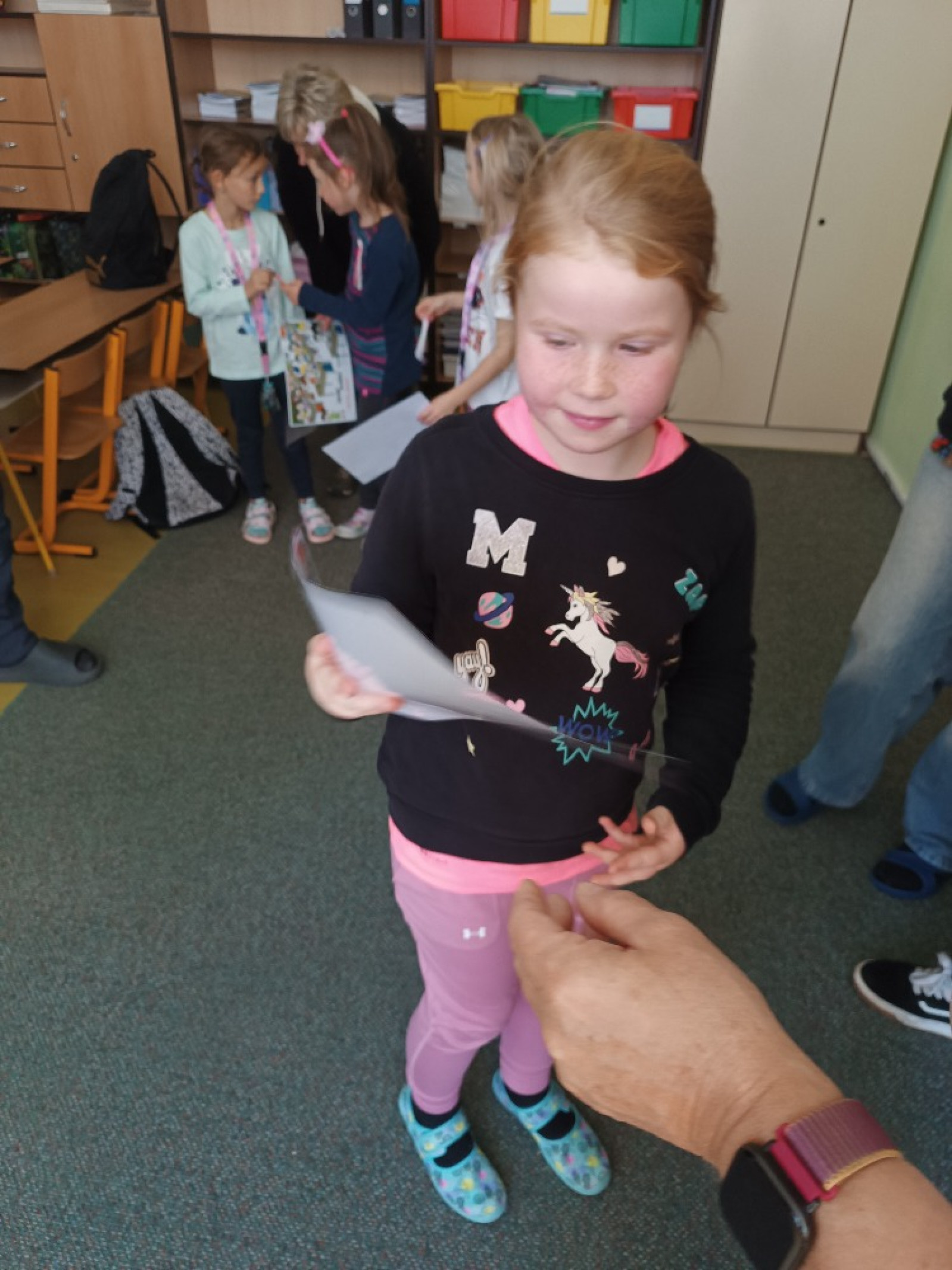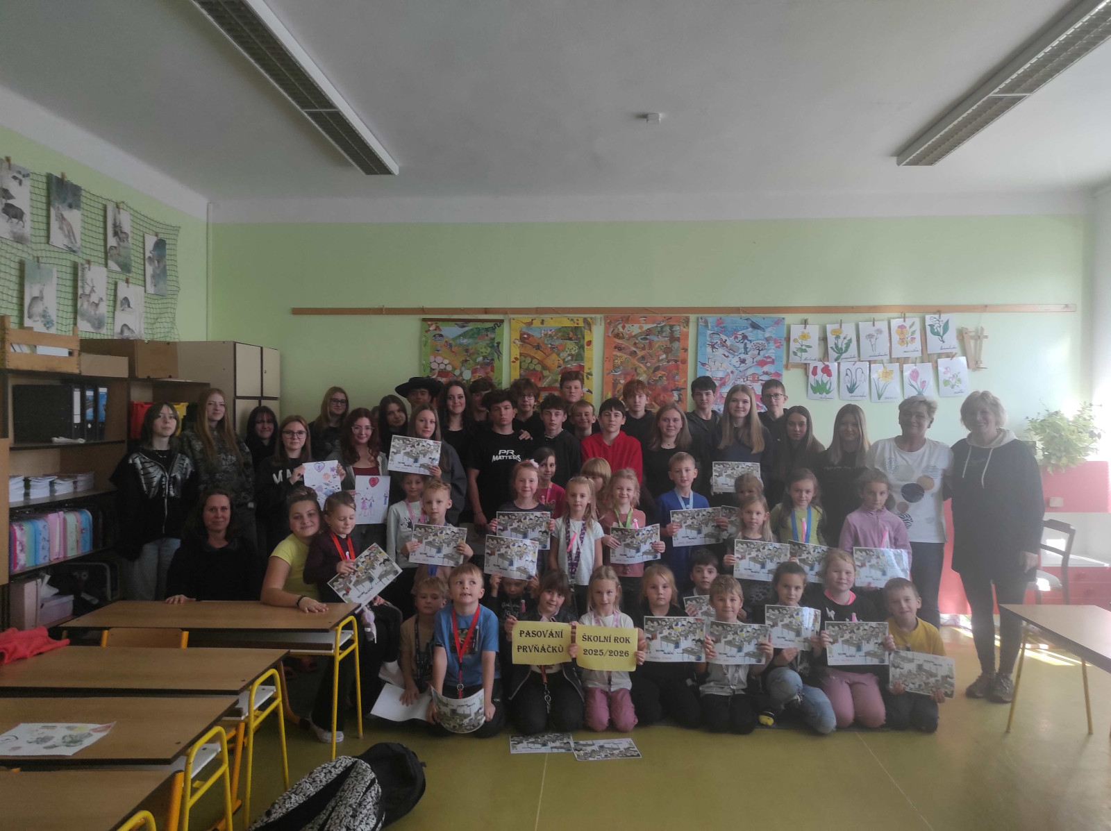 Dnešek byl pro nás prvňáky velmi důležitý. Stali jsme se totiž těmi pravými školáky. Přišli za námi ostřílení deváťáci a připravili si pro nás různé herní aktivity. Na označených stanovištích v celém areálu školy jsme pod jejich vedením plnili zajímavé úkoly. Museli jsme po hmatu poznávat některé školní pomůcky, trefovali jsme se míčky do lahvových terčů, skákali jsme od mety k metě v pytlích, skládali jsme puzzle na rychlost, svou zručnost jsme si vyzkoušeli ve štafetovém běhu s míčkem na lžíci. Ještě než jsme do soutěží vyrazili, paní učitelka nás chtěla potrápit skládáním slov ze slabik, které jsme museli pokládat na stopy. Ty byly rozházené po koberci v družině. Jenže na nás si nepřišla, my totiž skládání slov hodně trénujeme v hodinách ČJ. To horší bylo házet provazovými kroužky na kříž s očíslovanými terči a sčítaly se nám body za zásah. To si s námi vyzkoušeli i deváťáci a nebylo to jednoduché ani pro ně, protože ti museli házet z větší vzdálenosti. A tak nám celé veselé dopoledne uteklo, ani nevíme jak. Na závěr nám naši starší parťáci udělali bránu ze svých rukou, předali nám stužky a pamětní listy a dvorní rytíř od krále Oty Prvního nás slavnostně pasoval na školáky prvňáky. Král Ota První nás bude provázet Živou abecedou a hlavně Slabikářem po celý školní rok. Už nám napsal několik dopisů a my se pilně učíme písmena, která nám v učebnici připravuje. Museli jsme naše starší kamarády také něčím obdarovat a potěšit, a tak jsme jim jako poděkování namalovali obrázky a zazpívali jim písničku o tom, jak jsme se rozloučili se školkou a hrdě se stali školáky prvňáky.