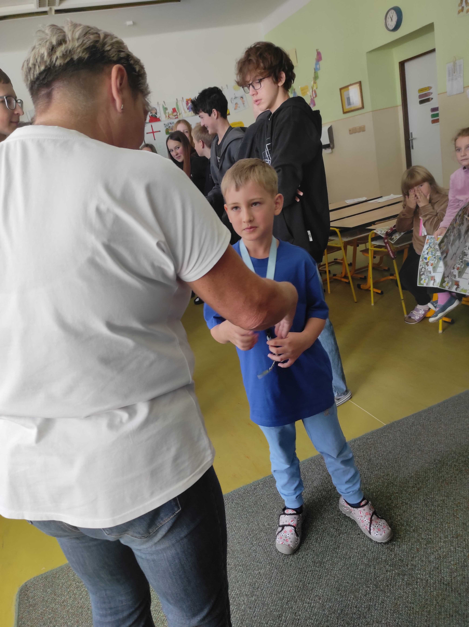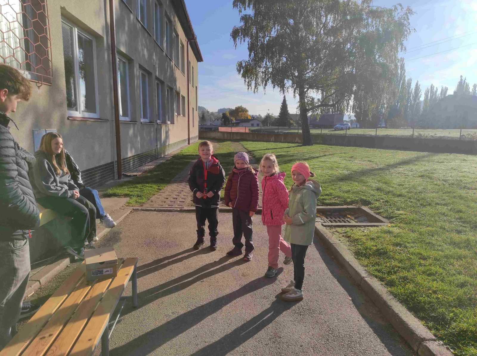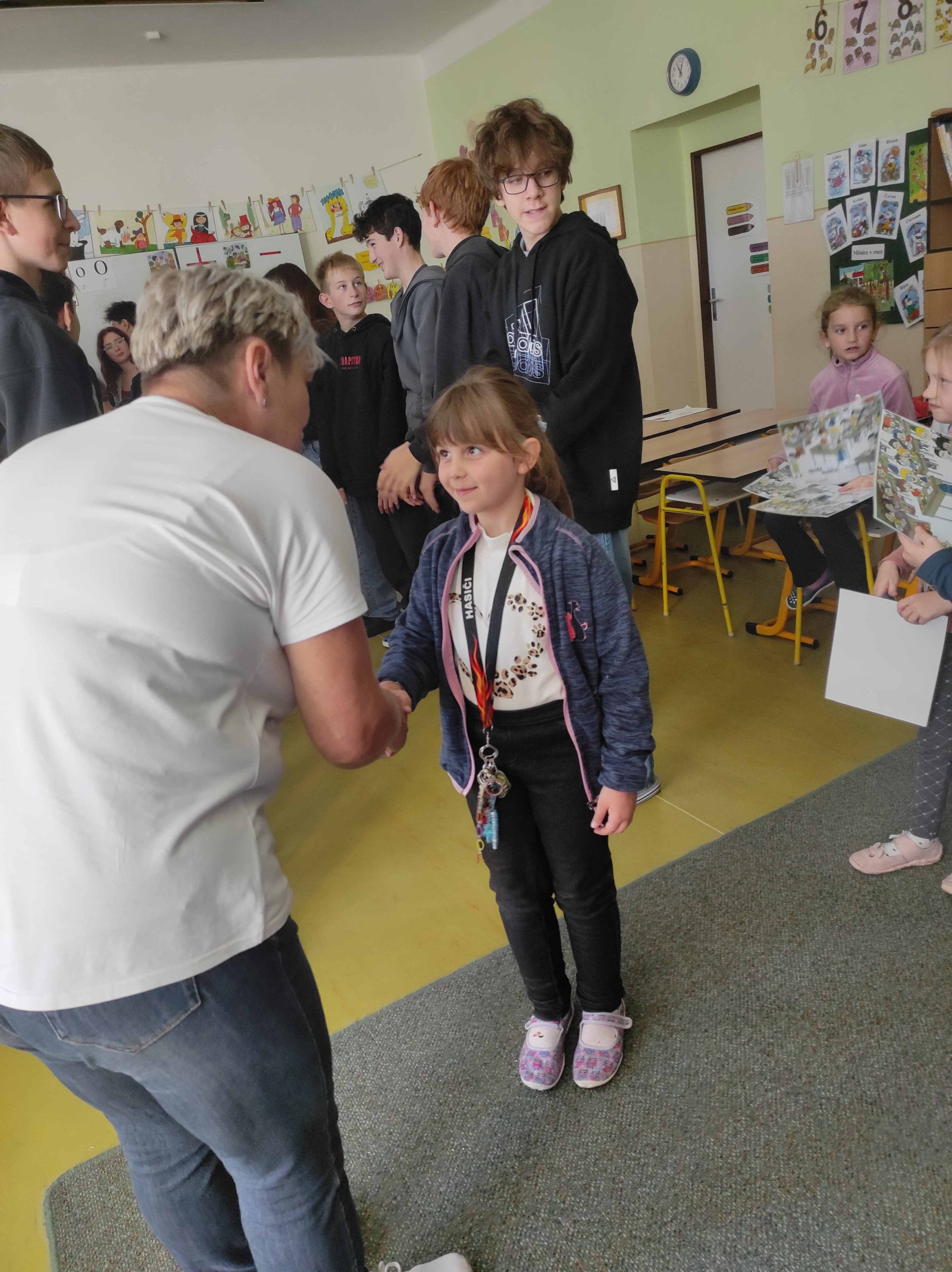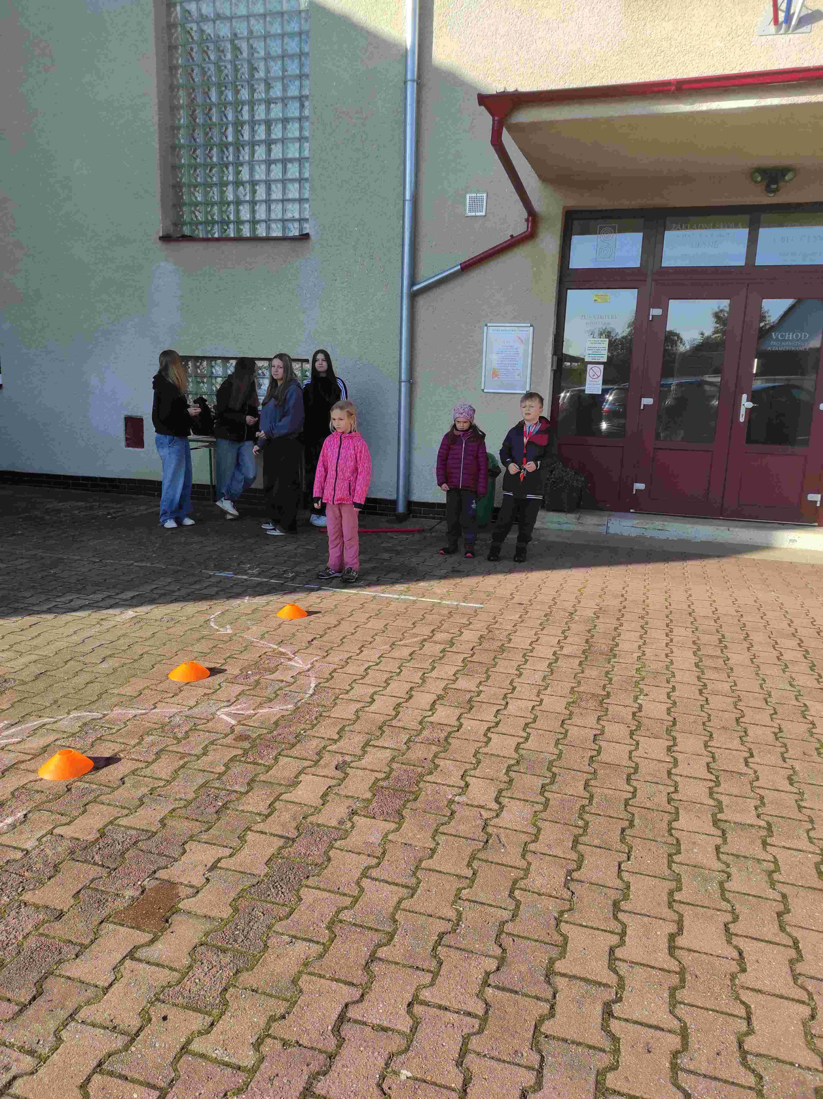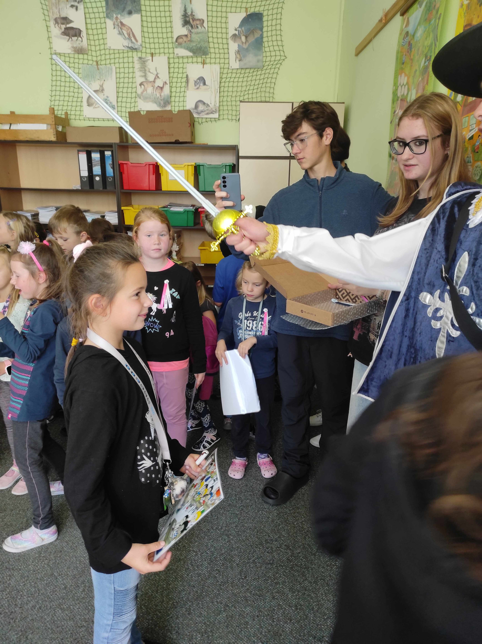 Dnešek byl pro nás prvňáky velmi důležitý. Stali jsme se totiž těmi pravými školáky. Přišli za námi ostřílení deváťáci a připravili si pro nás různé herní aktivity. Na označených stanovištích v celém areálu školy jsme pod jejich vedením plnili zajímavé úkoly. Museli jsme po hmatu poznávat některé školní pomůcky, trefovali jsme se míčky do lahvových terčů, skákali jsme od mety k metě v pytlích, skládali jsme puzzle na rychlost, svou zručnost jsme si vyzkoušeli ve štafetovém běhu s míčkem na lžíci. Ještě než jsme do soutěží vyrazili, paní učitelka nás chtěla potrápit skládáním slov ze slabik, které jsme museli pokládat na stopy. Ty byly rozházené po koberci v družině. Jenže na nás si nepřišla, my totiž skládání slov hodně trénujeme v hodinách ČJ. To horší bylo házet provazovými kroužky na kříž s očíslovanými terči a sčítaly se nám body za zásah. To si s námi vyzkoušeli i deváťáci a nebylo to jednoduché ani pro ně, protože ti museli házet z větší vzdálenosti. A tak nám celé veselé dopoledne uteklo, ani nevíme jak. Na závěr nám naši starší parťáci udělali bránu ze svých rukou, předali nám stužky a pamětní listy a dvorní rytíř od krále Oty Prvního nás slavnostně pasoval na školáky prvňáky. Král Ota První nás bude provázet Živou abecedou a hlavně Slabikářem po celý školní rok. Už nám napsal několik dopisů a my se pilně učíme písmena, která nám v učebnici připravuje. Museli jsme naše starší kamarády také něčím obdarovat a potěšit, a tak jsme jim jako poděkování namalovali obrázky a zazpívali jim písničku o tom, jak jsme se rozloučili se školkou a hrdě se stali školáky prvňáky.