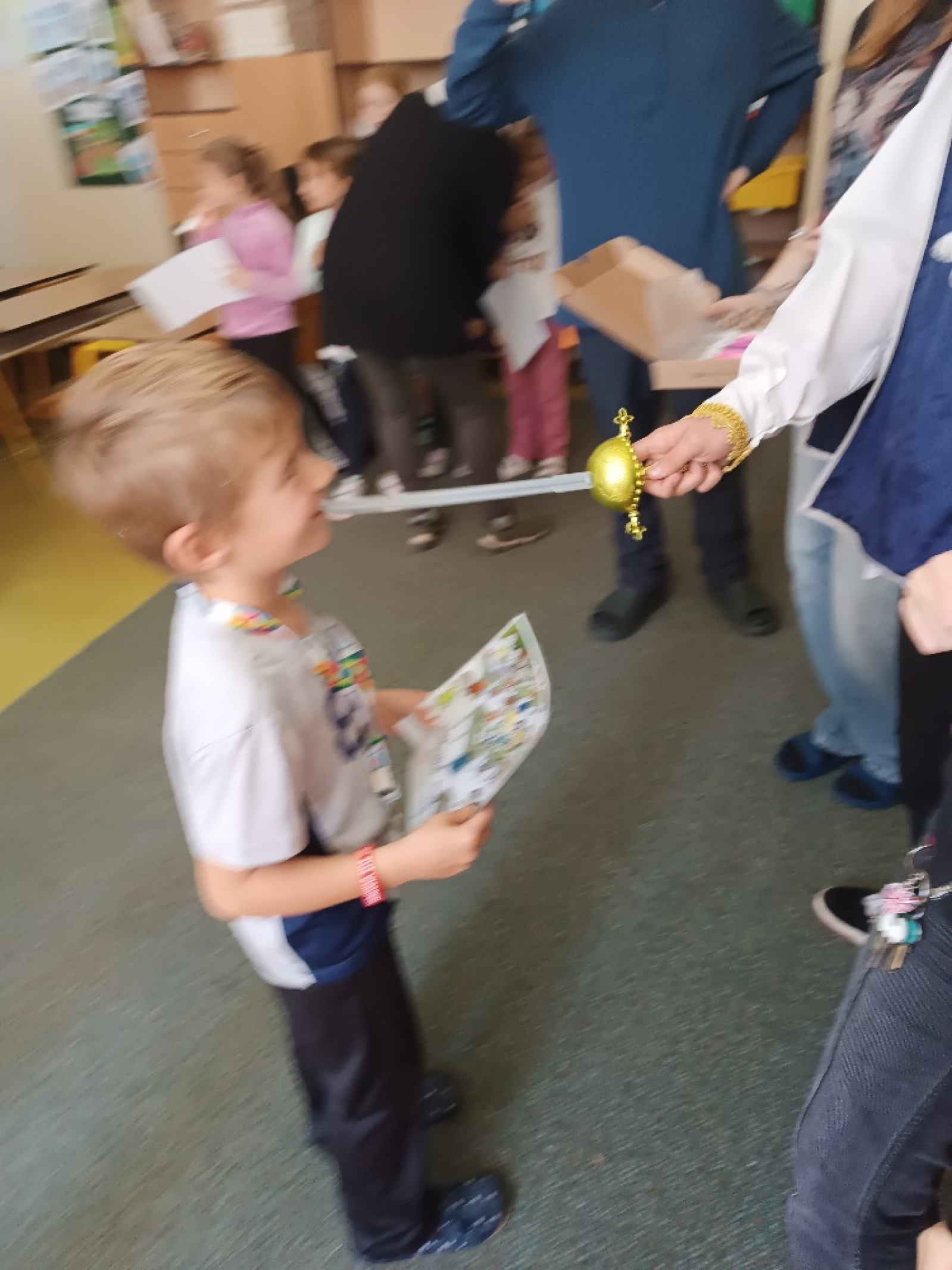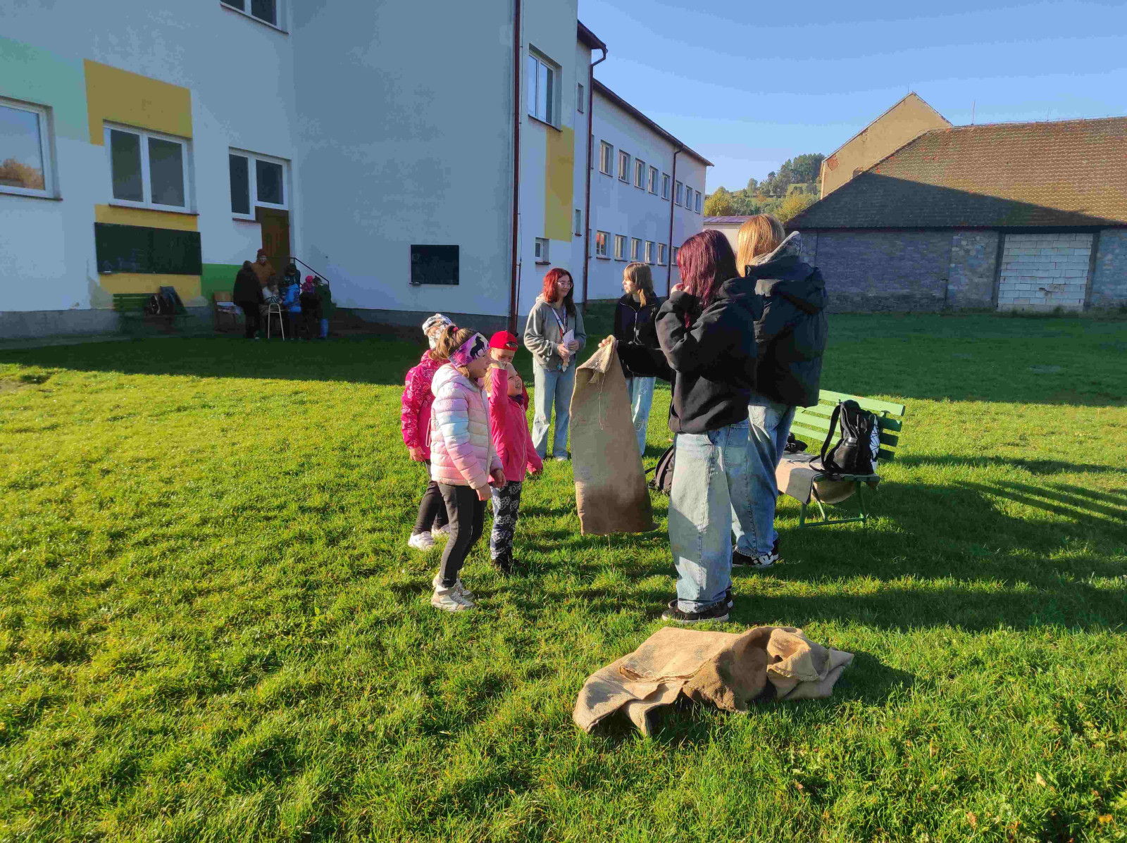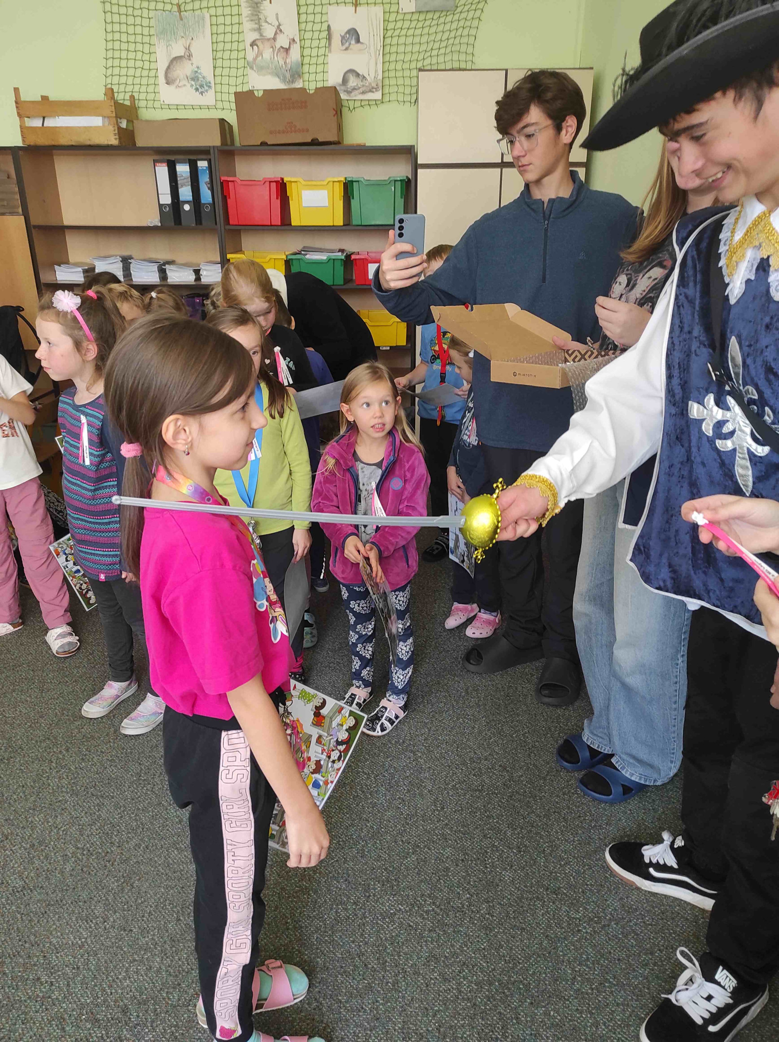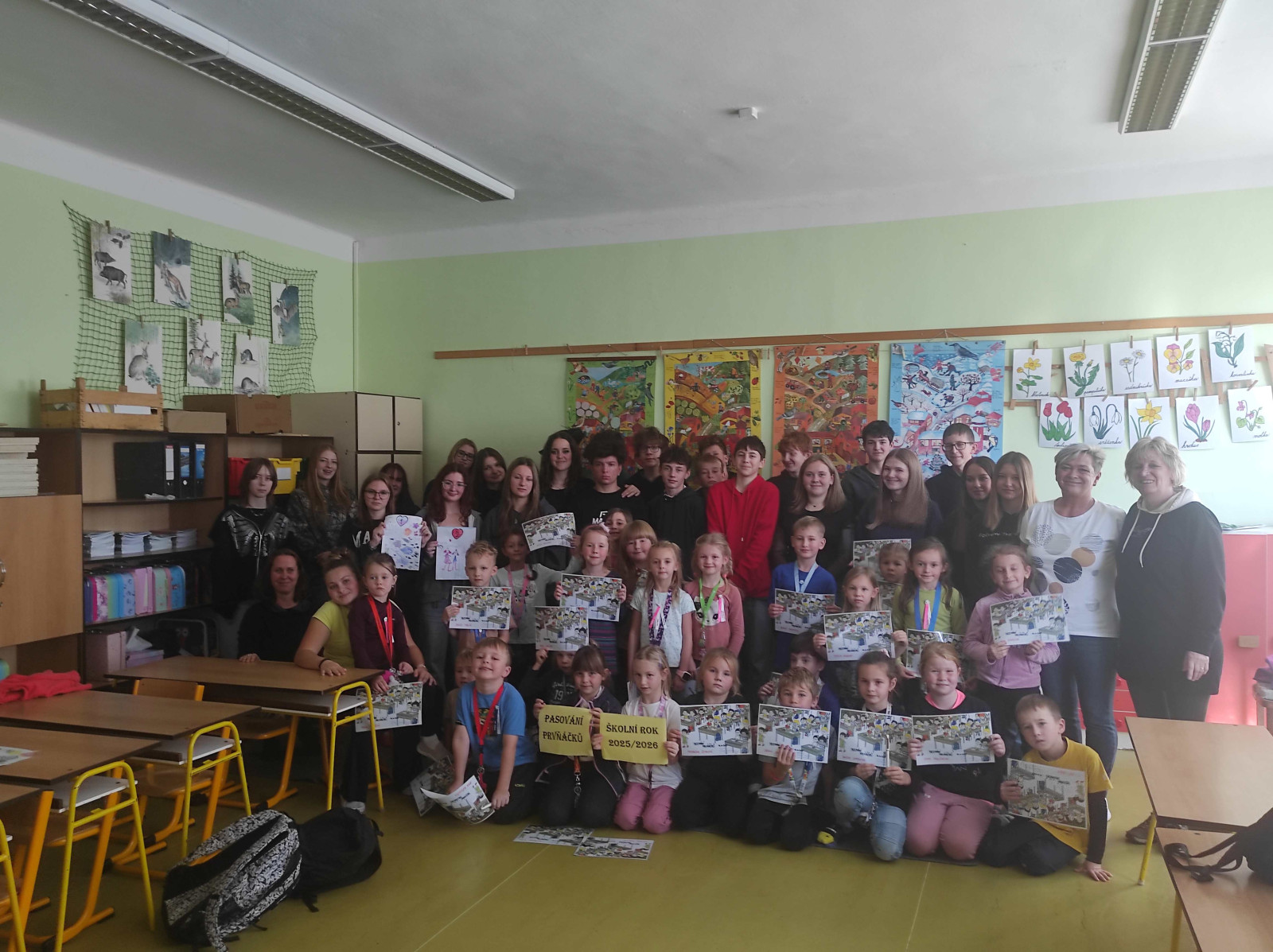 Dnešek byl pro nás prvňáky velmi důležitý. Stali jsme se totiž těmi pravými školáky. Přišli za námi ostřílení deváťáci a připravili si pro nás různé herní aktivity. Na označených stanovištích v celém areálu školy jsme pod jejich vedením plnili zajímavé úkoly. Museli jsme po hmatu poznávat některé školní pomůcky, trefovali jsme se míčky do lahvových terčů, skákali jsme od mety k metě v pytlích, skládali jsme puzzle na rychlost, svou zručnost jsme si vyzkoušeli ve štafetovém běhu s míčkem na lžíci. Ještě než jsme do soutěží vyrazili, paní učitelka nás chtěla potrápit skládáním slov ze slabik, které jsme museli pokládat na stopy. Ty byly rozházené po koberci v družině. Jenže na nás si nepřišla, my totiž skládání slov hodně trénujeme v hodinách ČJ. To horší bylo házet provazovými kroužky na kříž s očíslovanými terči a sčítaly se nám body za zásah. To si s námi vyzkoušeli i deváťáci a nebylo to jednoduché ani pro ně, protože ti museli házet z větší vzdálenosti. A tak nám celé veselé dopoledne uteklo, ani nevíme jak. Na závěr nám naši starší parťáci udělali bránu ze svých rukou, předali nám stužky a pamětní listy a dvorní rytíř od krále Oty Prvního nás slavnostně pasoval na školáky prvňáky. Král Ota První nás bude provázet Živou abecedou a hlavně Slabikářem po celý školní rok. Už nám napsal několik dopisů a my se pilně učíme písmena, která nám v učebnici připravuje. Museli jsme naše starší kamarády také něčím obdarovat a potěšit, a tak jsme jim jako poděkování namalovali obrázky a zazpívali jim písničku o tom, jak jsme se rozloučili se školkou a hrdě se stali školáky prvňáky.
