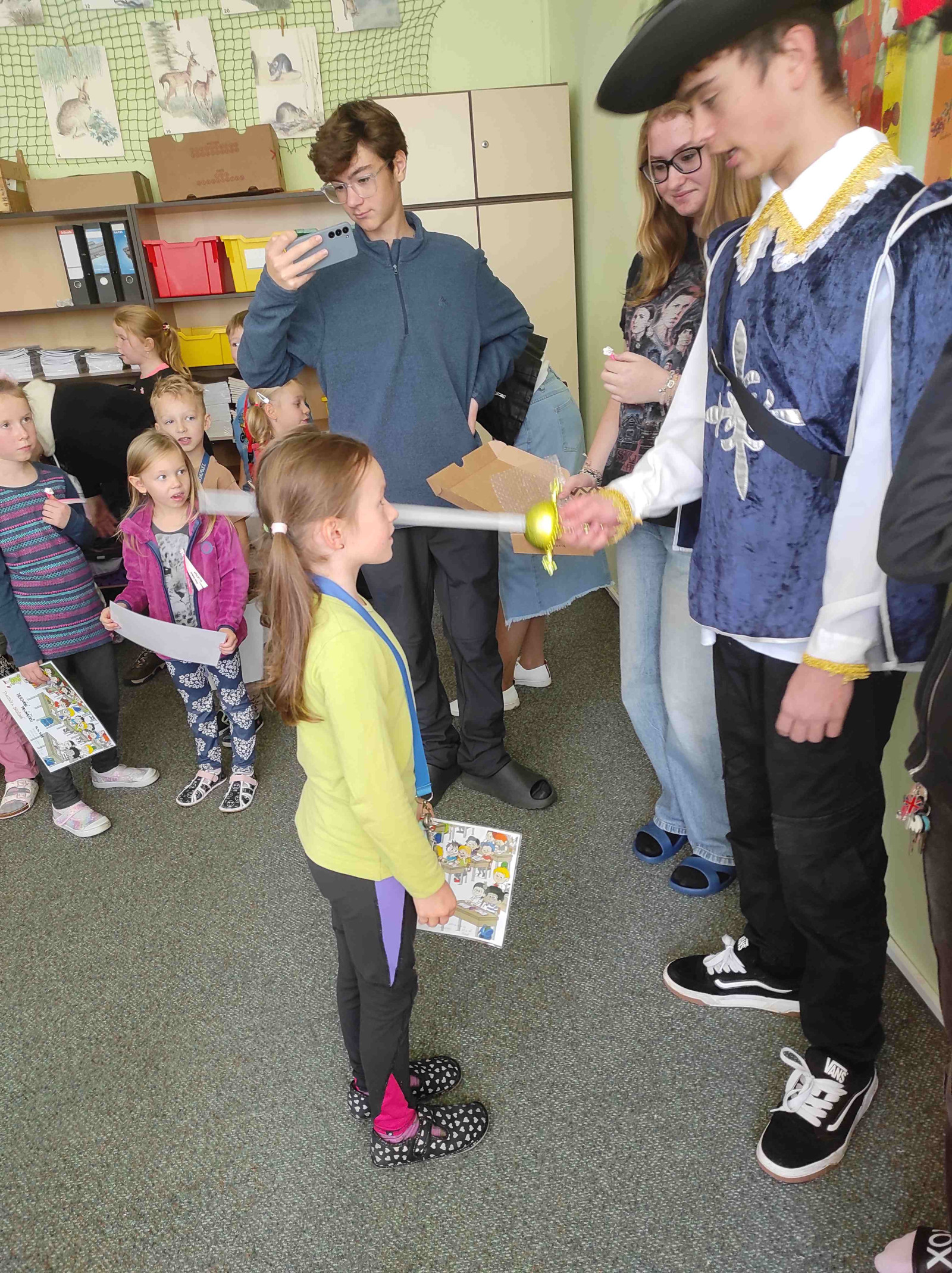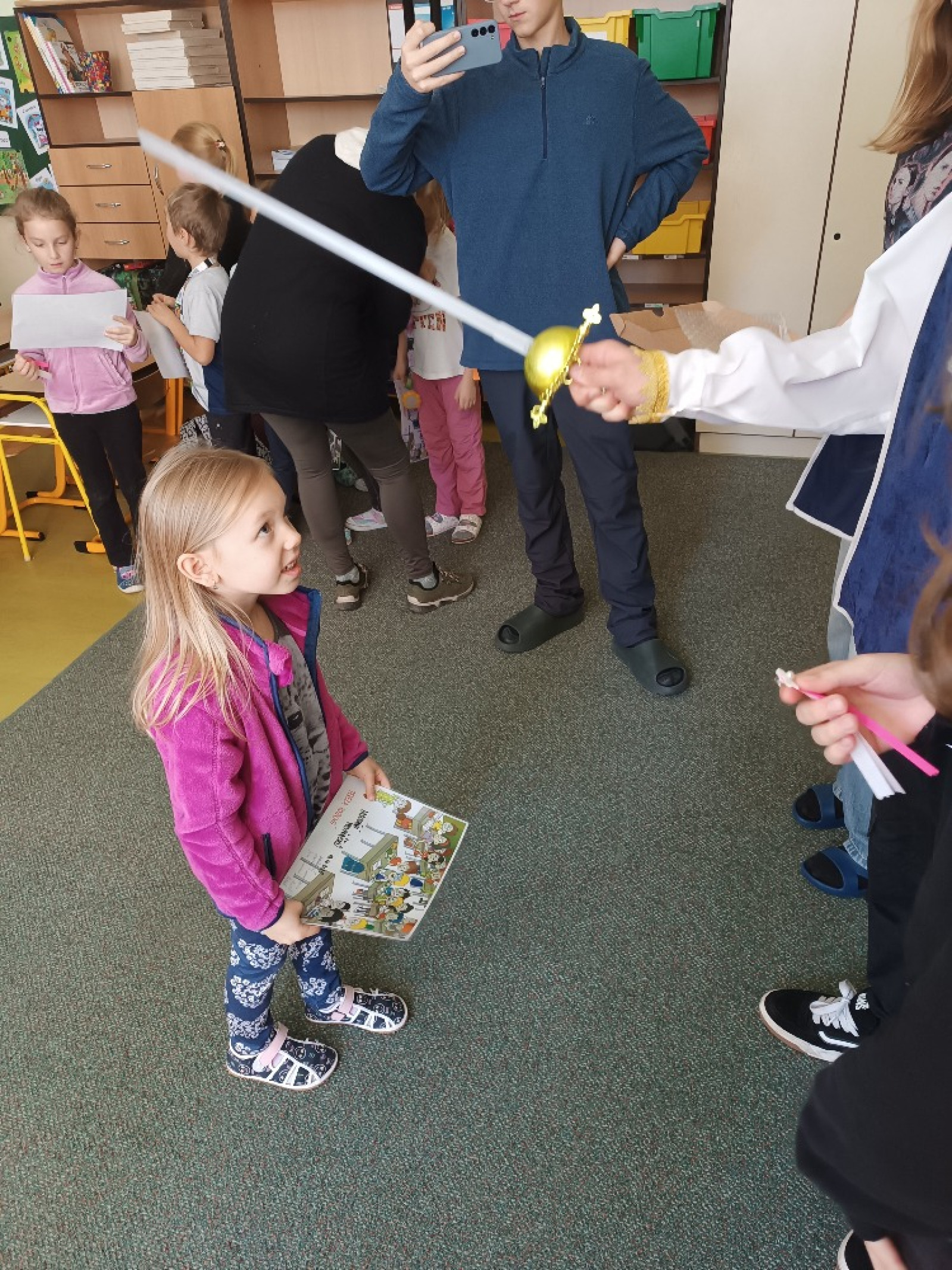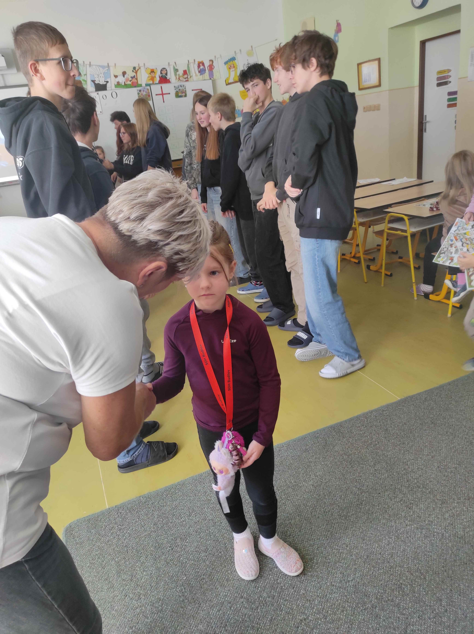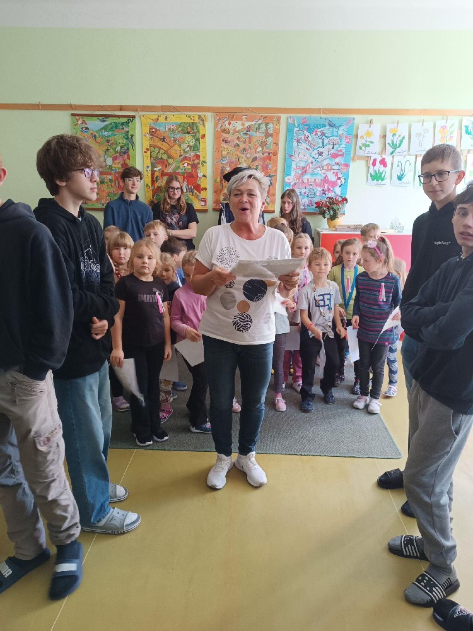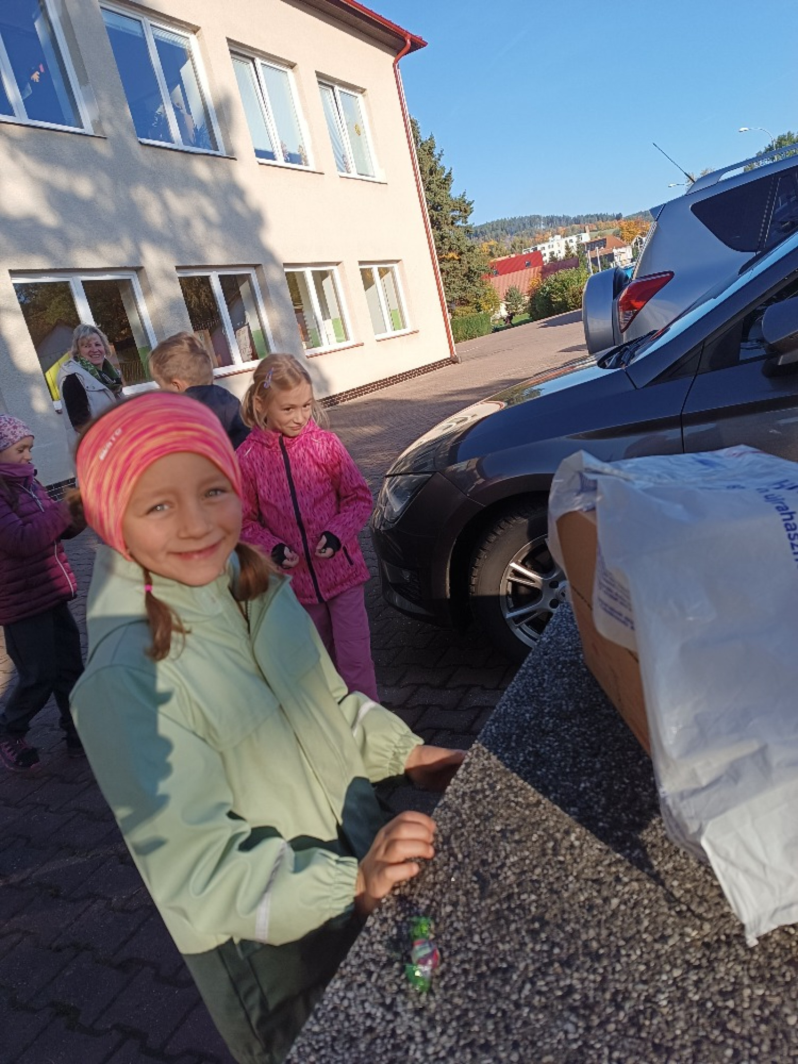 Dnešek byl pro nás prvňáky velmi důležitý. Stali jsme se totiž těmi pravými školáky. Přišli za námi ostřílení deváťáci a připravili si pro nás různé herní aktivity. Na označených stanovištích v celém areálu školy jsme pod jejich vedením plnili zajímavé úkoly. Museli jsme po hmatu poznávat některé školní pomůcky, trefovali jsme se míčky do lahvových terčů, skákali jsme od mety k metě v pytlích, skládali jsme puzzle na rychlost, svou zručnost jsme si vyzkoušeli ve štafetovém běhu s míčkem na lžíci. Ještě než jsme do soutěží vyrazili, paní učitelka nás chtěla potrápit skládáním slov ze slabik, které jsme museli pokládat na stopy. Ty byly rozházené po koberci v družině. Jenže na nás si nepřišla, my totiž skládání slov hodně trénujeme v hodinách ČJ. To horší bylo házet provazovými kroužky na kříž s očíslovanými terči a sčítaly se nám body za zásah. To si s námi vyzkoušeli i deváťáci a nebylo to jednoduché ani pro ně, protože ti museli házet z větší vzdálenosti. A tak nám celé veselé dopoledne uteklo, ani nevíme jak. Na závěr nám naši starší parťáci udělali bránu ze svých rukou, předali nám stužky a pamětní listy a dvorní rytíř od krále Oty Prvního nás slavnostně pasoval na školáky prvňáky. Král Ota První nás bude provázet Živou abecedou a hlavně Slabikářem po celý školní rok. Už nám napsal několik dopisů a my se pilně učíme písmena, která nám v učebnici připravuje. Museli jsme naše starší kamarády také něčím obdarovat a potěšit, a tak jsme jim jako poděkování namalovali obrázky a zazpívali jim písničku o tom, jak jsme se rozloučili se školkou a hrdě se stali školáky prvňáky.