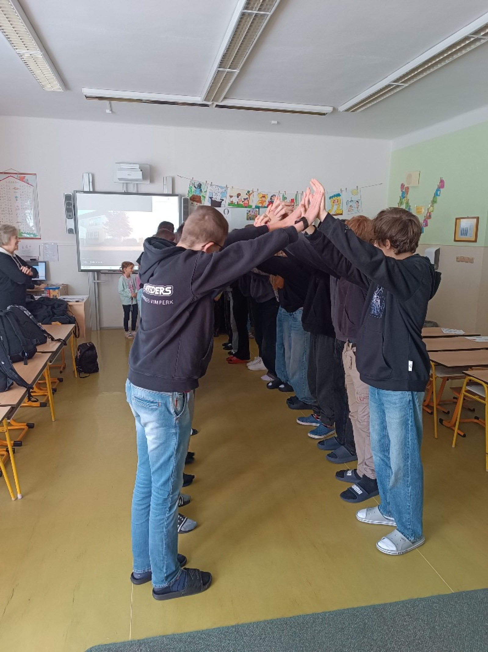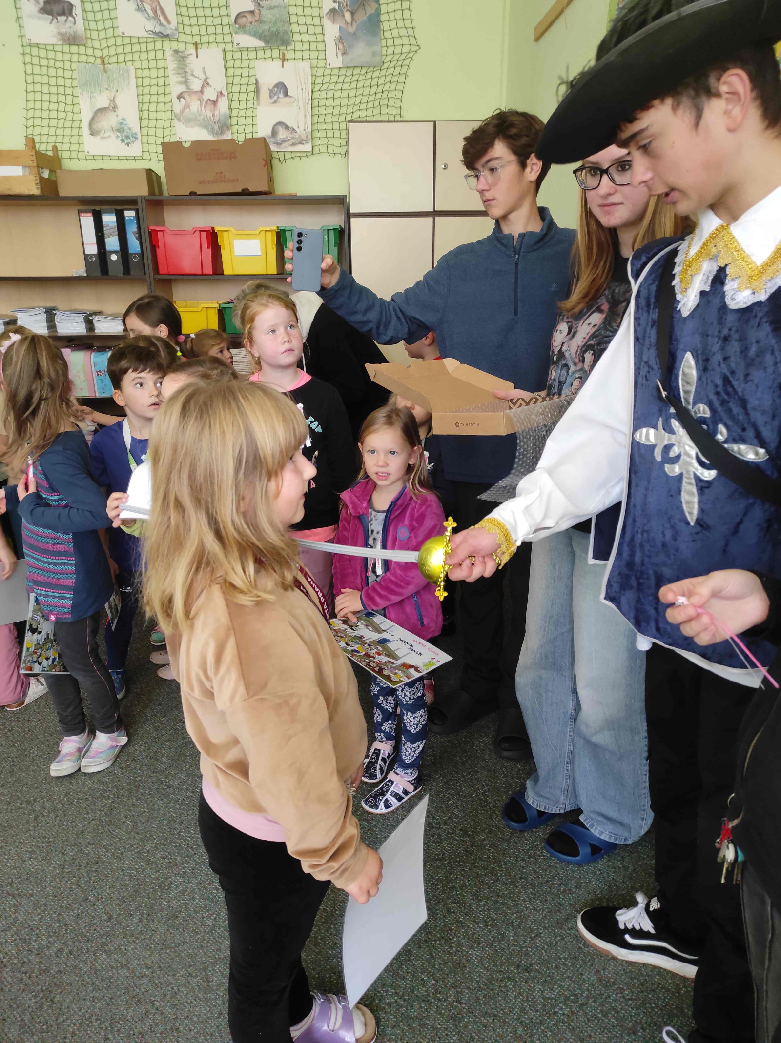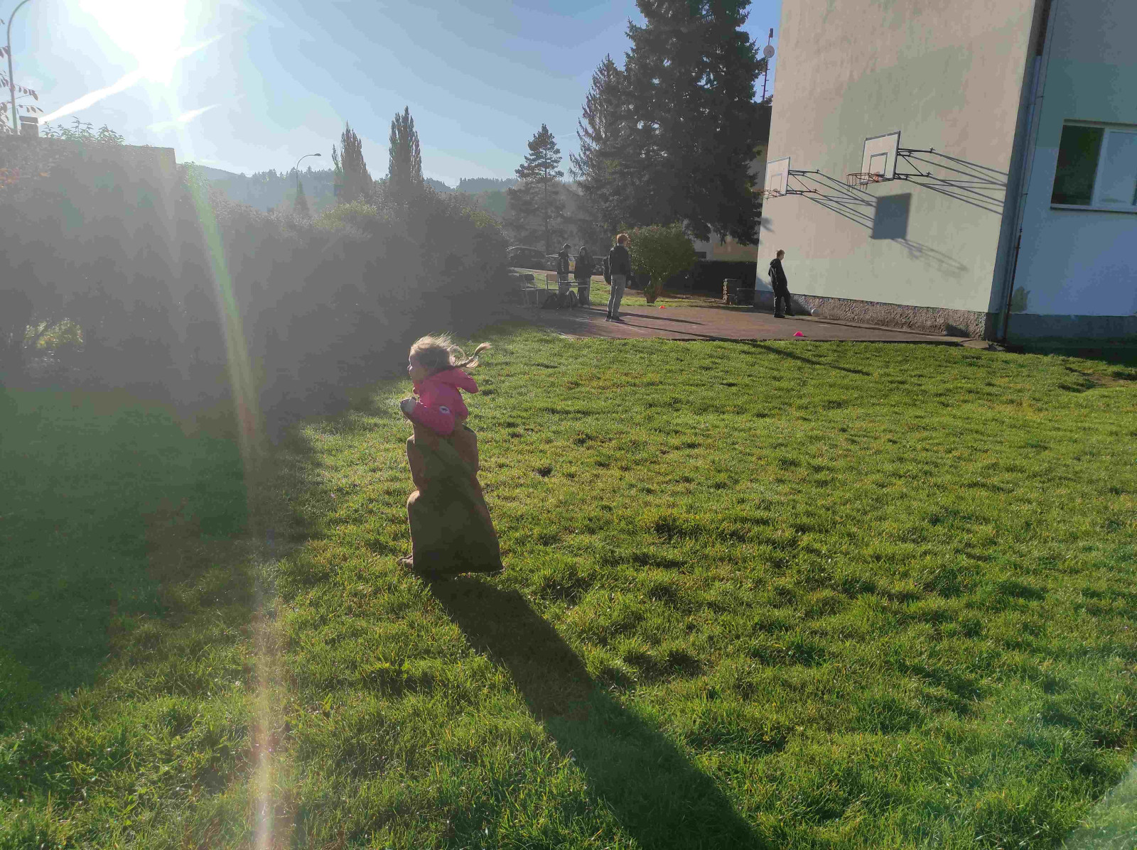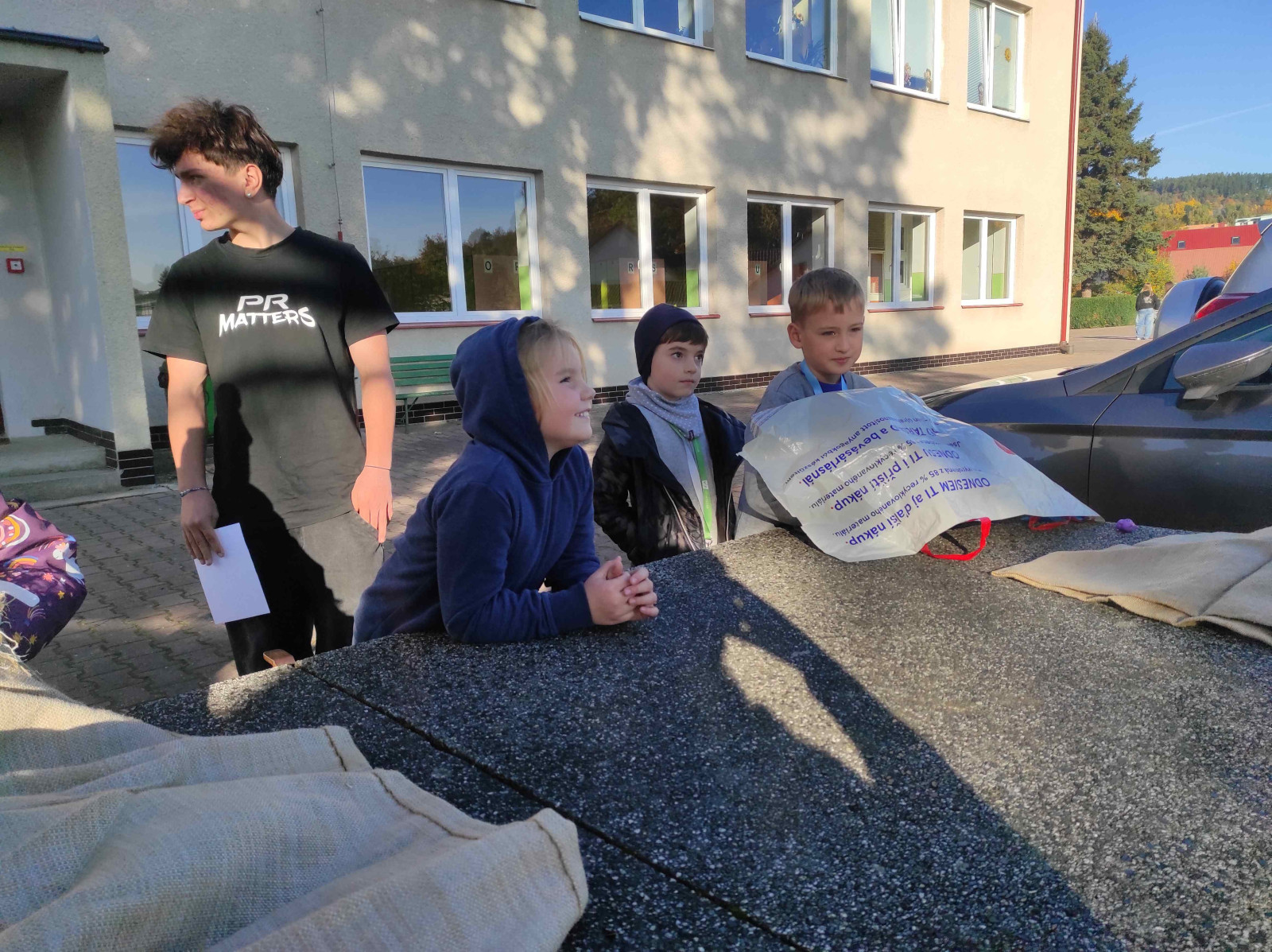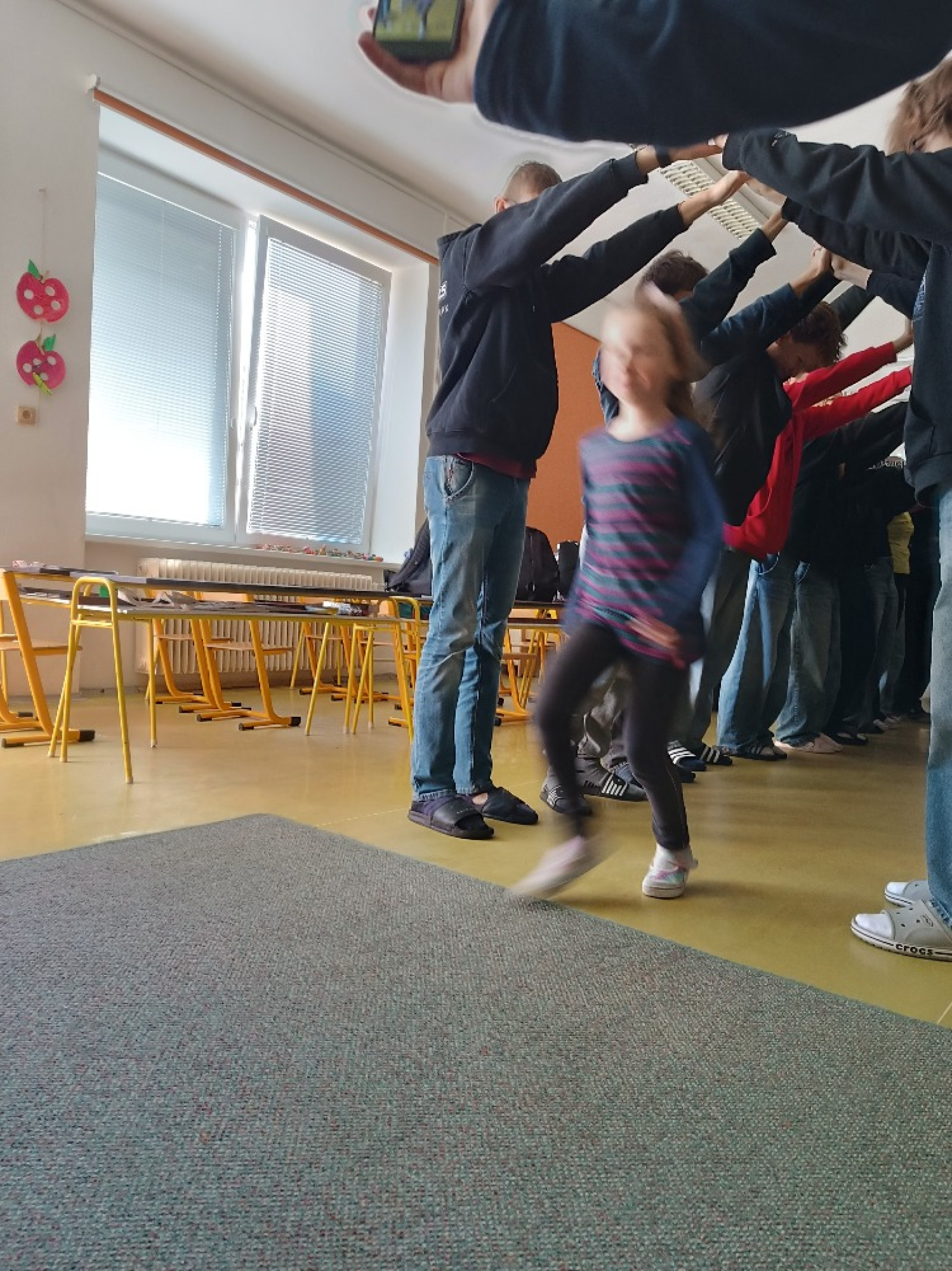 Dnešek byl pro nás prvňáky velmi důležitý. Stali jsme se totiž těmi pravými školáky. Přišli za námi ostřílení deváťáci a připravili si pro nás různé herní aktivity. Na označených stanovištích v celém areálu školy jsme pod jejich vedením plnili zajímavé úkoly. Museli jsme po hmatu poznávat některé školní pomůcky, trefovali jsme se míčky do lahvových terčů, skákali jsme od mety k metě v pytlích, skládali jsme puzzle na rychlost, svou zručnost jsme si vyzkoušeli ve štafetovém běhu s míčkem na lžíci. Ještě než jsme do soutěží vyrazili, paní učitelka nás chtěla potrápit skládáním slov ze slabik, které jsme museli pokládat na stopy. Ty byly rozházené po koberci v družině. Jenže na nás si nepřišla, my totiž skládání slov hodně trénujeme v hodinách ČJ. To horší bylo házet provazovými kroužky na kříž s očíslovanými terči a sčítaly se nám body za zásah. To si s námi vyzkoušeli i deváťáci a nebylo to jednoduché ani pro ně, protože ti museli házet z větší vzdálenosti. A tak nám celé veselé dopoledne uteklo, ani nevíme jak. Na závěr nám naši starší parťáci udělali bránu ze svých rukou, předali nám stužky a pamětní listy a dvorní rytíř od krále Oty Prvního nás slavnostně pasoval na školáky prvňáky. Král Ota První nás bude provázet Živou abecedou a hlavně Slabikářem po celý školní rok. Už nám napsal několik dopisů a my se pilně učíme písmena, která nám v učebnici připravuje. Museli jsme naše starší kamarády také něčím obdarovat a potěšit, a tak jsme jim jako poděkování namalovali obrázky a zazpívali jim písničku o tom, jak jsme se rozloučili se školkou a hrdě se stali školáky prvňáky.