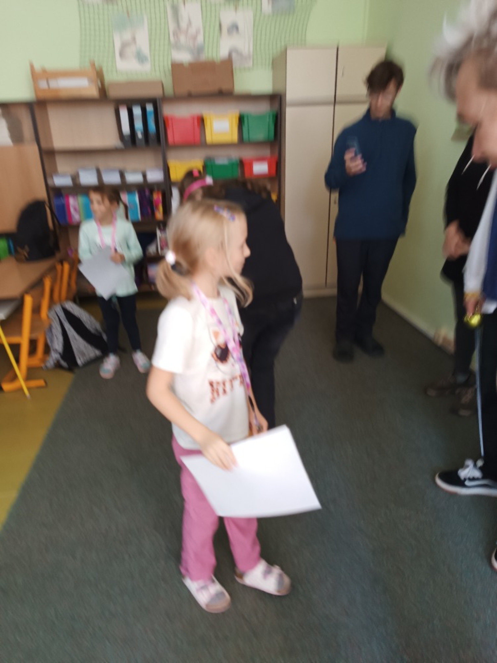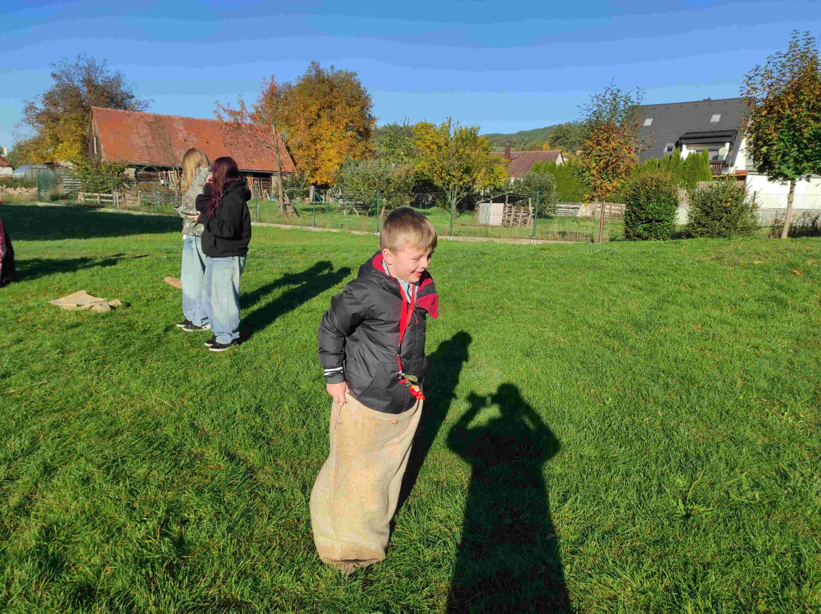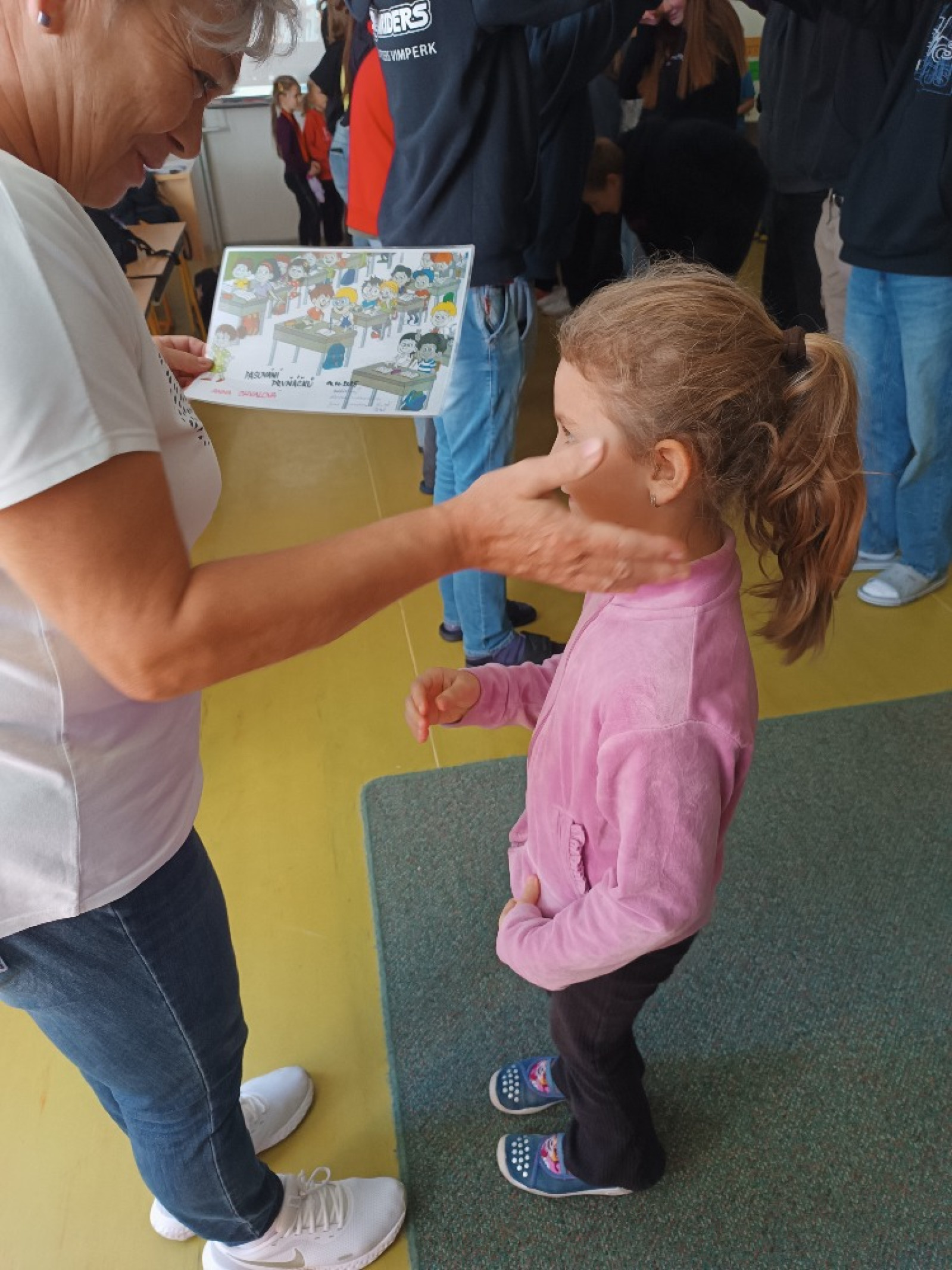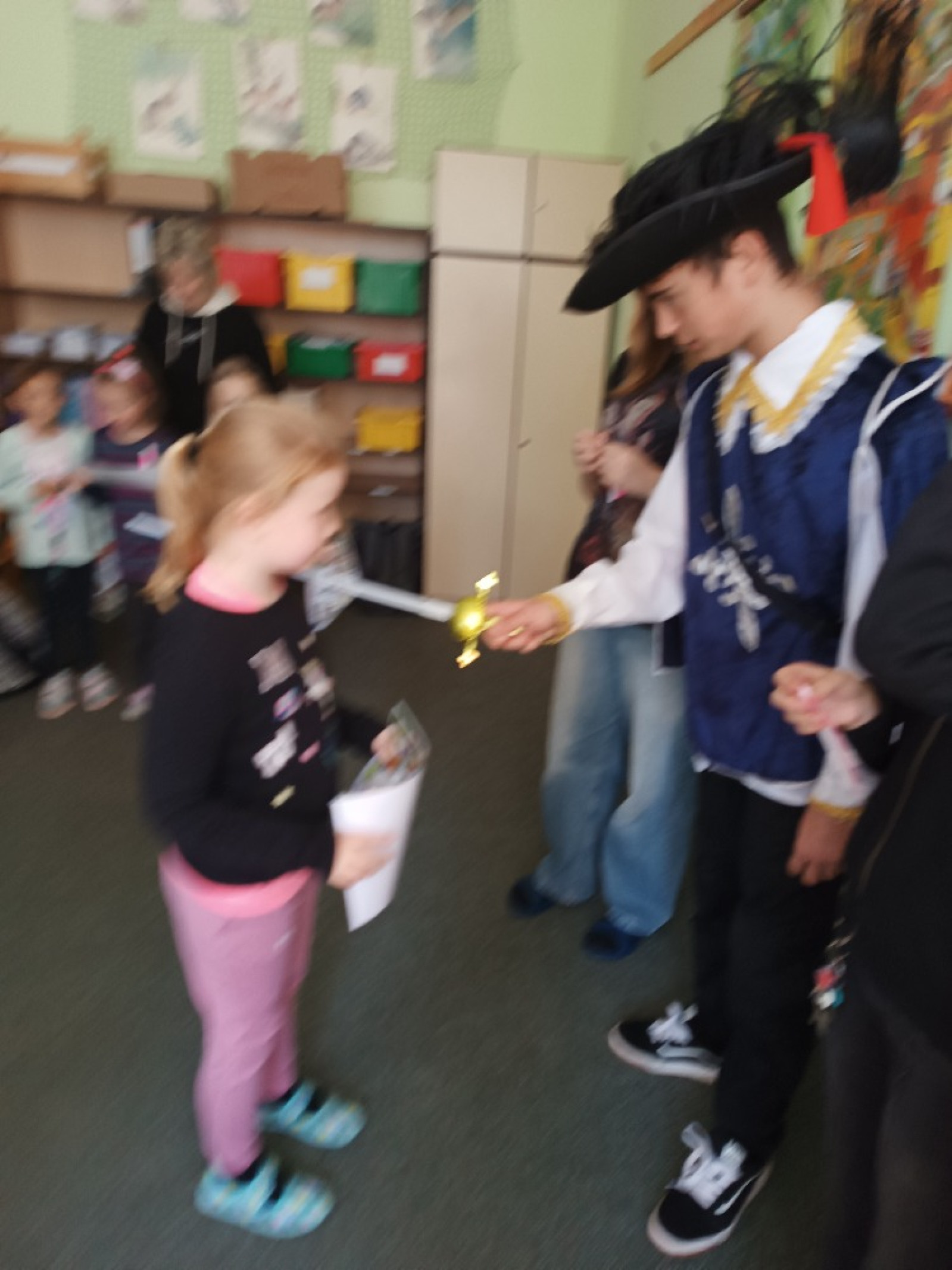 Dnešek byl pro nás prvňáky velmi důležitý. Stali jsme se totiž těmi pravými školáky. Přišli za námi ostřílení deváťáci a připravili si pro nás různé herní aktivity. Na označených stanovištích v celém areálu školy jsme pod jejich vedením plnili zajímavé úkoly. Museli jsme po hmatu poznávat některé školní pomůcky, trefovali jsme se míčky do lahvových terčů, skákali jsme od mety k metě v pytlích, skládali jsme puzzle na rychlost, svou zručnost jsme si vyzkoušeli ve štafetovém běhu s míčkem na lžíci. Ještě než jsme do soutěží vyrazili, paní učitelka nás chtěla potrápit skládáním slov ze slabik, které jsme museli pokládat na stopy. Ty byly rozházené po koberci v družině. Jenže na nás si nepřišla, my totiž skládání slov hodně trénujeme v hodinách ČJ. To horší bylo házet provazovými kroužky na kříž s očíslovanými terči a sčítaly se nám body za zásah. To si s námi vyzkoušeli i deváťáci a nebylo to jednoduché ani pro ně, protože ti museli házet z větší vzdálenosti. A tak nám celé veselé dopoledne uteklo, ani nevíme jak. Na závěr nám naši starší parťáci udělali bránu ze svých rukou, předali nám stužky a pamětní listy a dvorní rytíř od krále Oty Prvního nás slavnostně pasoval na školáky prvňáky. Král Ota První nás bude provázet Živou abecedou a hlavně Slabikářem po celý školní rok. Už nám napsal několik dopisů a my se pilně učíme písmena, která nám v učebnici připravuje. Museli jsme naše starší kamarády také něčím obdarovat a potěšit, a tak jsme jim jako poděkování namalovali obrázky a zazpívali jim písničku o tom, jak jsme se rozloučili se školkou a hrdě se stali školáky prvňáky.