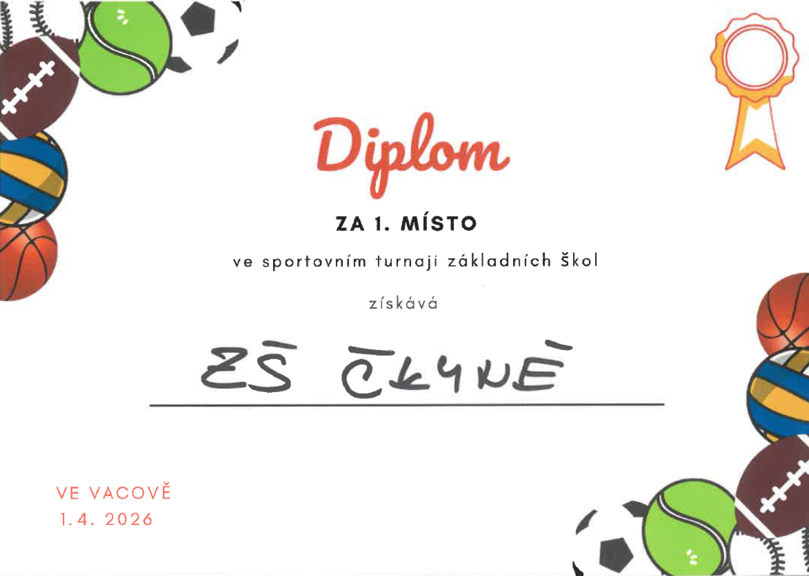 Ve středu 1. 4. 2026 se v tělocvičně ZŠ Vacov konal Sportovní turnaj pro žáky II. stupně, ve kterém mezi sebou poměřili síly ZŠ Vacov, ZŠ Zdíkov a ZŠ Čkyně. Turnaj byl rozdělen na dvě části. První část patřila florbalu a druhá sálové kopané. Výsledky z obou částí se započítávali do celkového hodnocení turnaje. V první části naši žáci nenašli přemožitele a florbal vyhráli 2:0 nad ZŠ Vacov a 4:2 nad ZŠ Zdíkov. Bohužel hned v úvodu druhé části turnaje podlehli v sálové kopané vysoko 1:7 ZŠ Vacov. Chuť si ale naši sportovci spravili v posledním zápase, kde vyhráli nad ZŠ Zdíkov 5:0. S devíti body za 3 vítězství a jednu prohru se umístili na prvním místě v celkovém hodnocení.