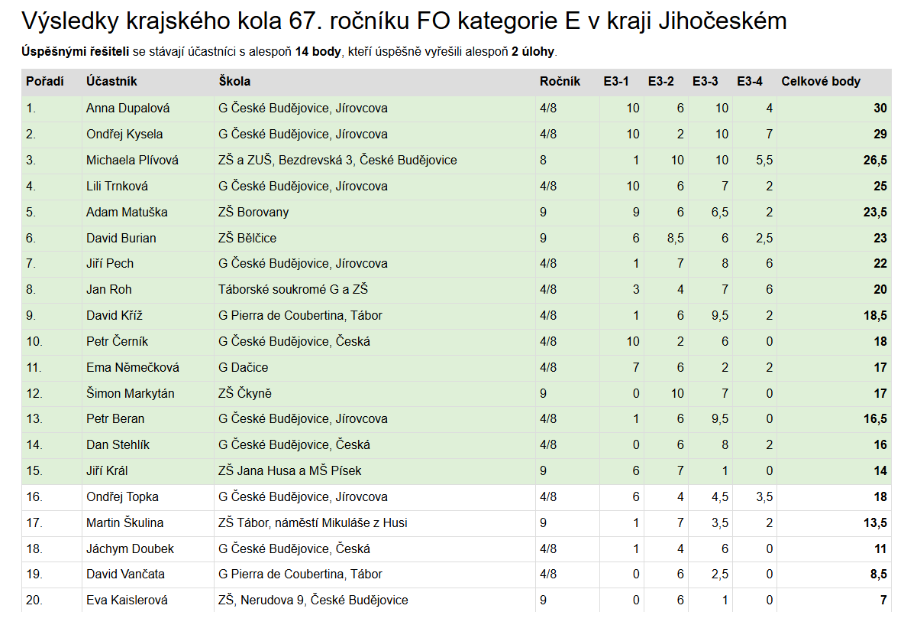 Protože se Šimon Markytán umístil na 1. místě v okresním kole Fyzikální olympiády, stal se úspěšným řešitelem, splnil tak podmínky k postupu do krajského kola, které se uskutečnilo v úterý 31. března 2026 v Českých Budějovicích. V konkurenci asi 20 žáků ze základních škol, ale především i víceletých gymnázií si Šimon vybojoval 12. místo! Mezi žáky základních škol obsadil 4. příčku!