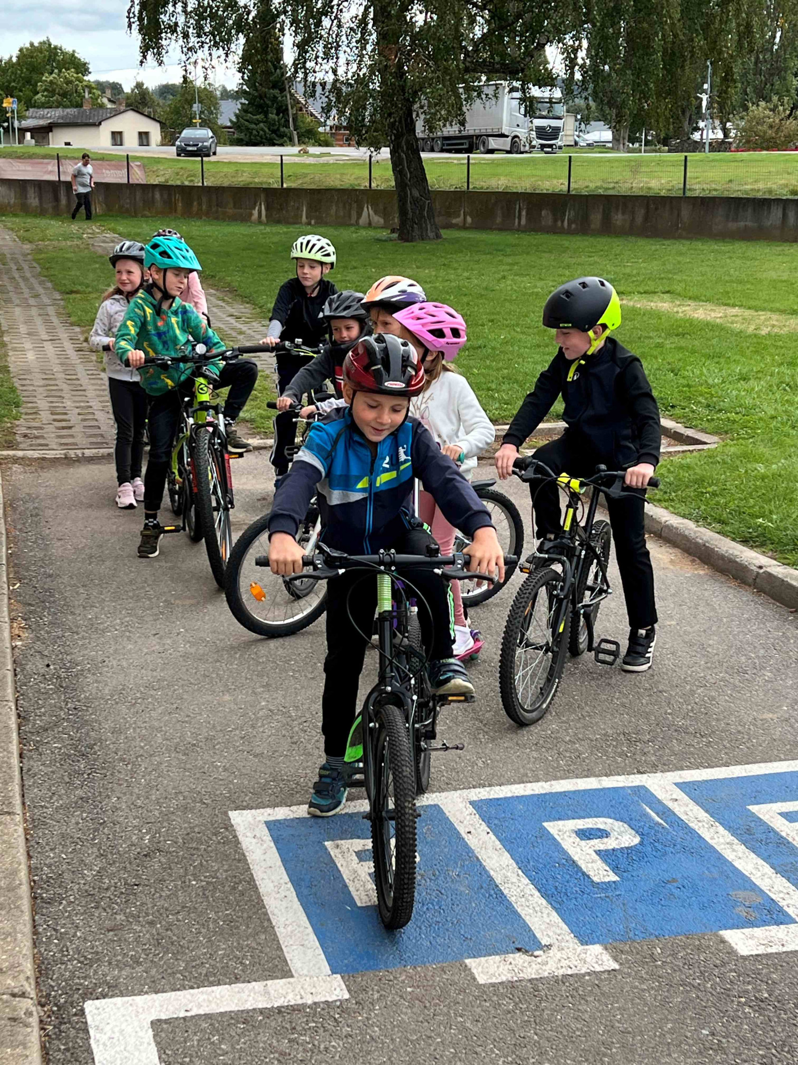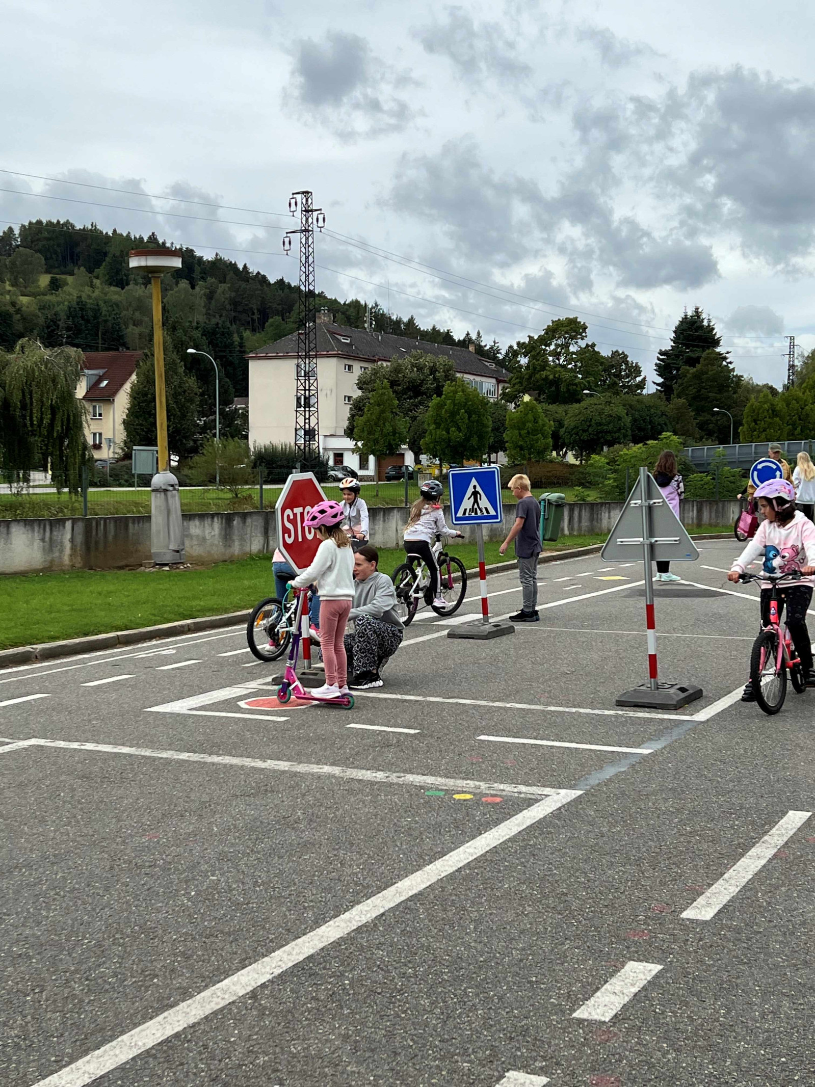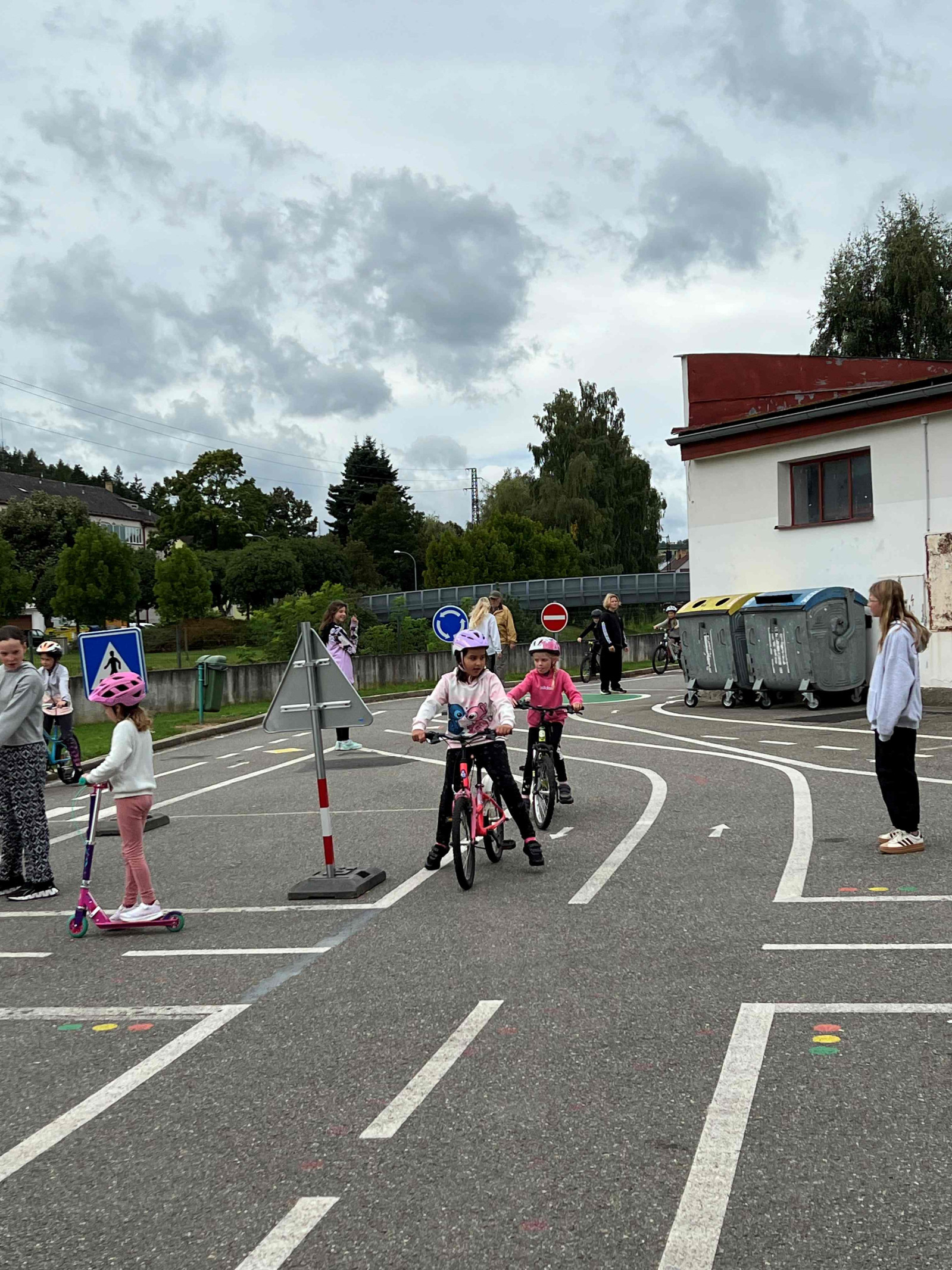 Ve druhé části si děti mohly nové poznatky vyzkoušet v praxi. Na dopravním hřišti dětem pomáhala nejen paní učitelka Chvostová, ale i šikovní dopravní asistenti ze 7. třídy. Dohlíželi a ochotně pomáhali, aby jízda na kole nebo koloběžce proběhla bezpečně a s úsměvem.