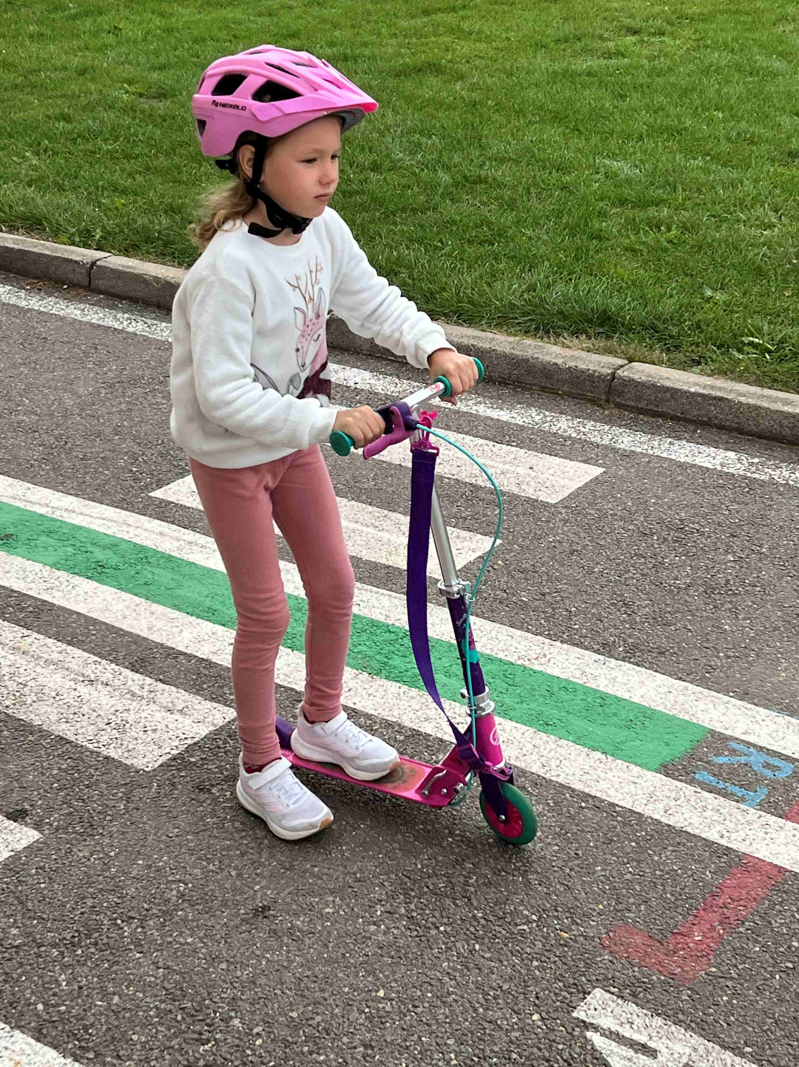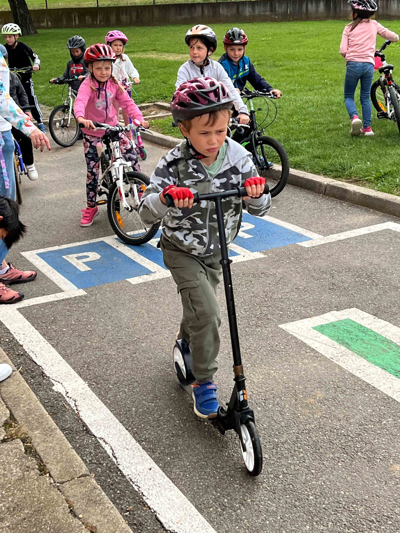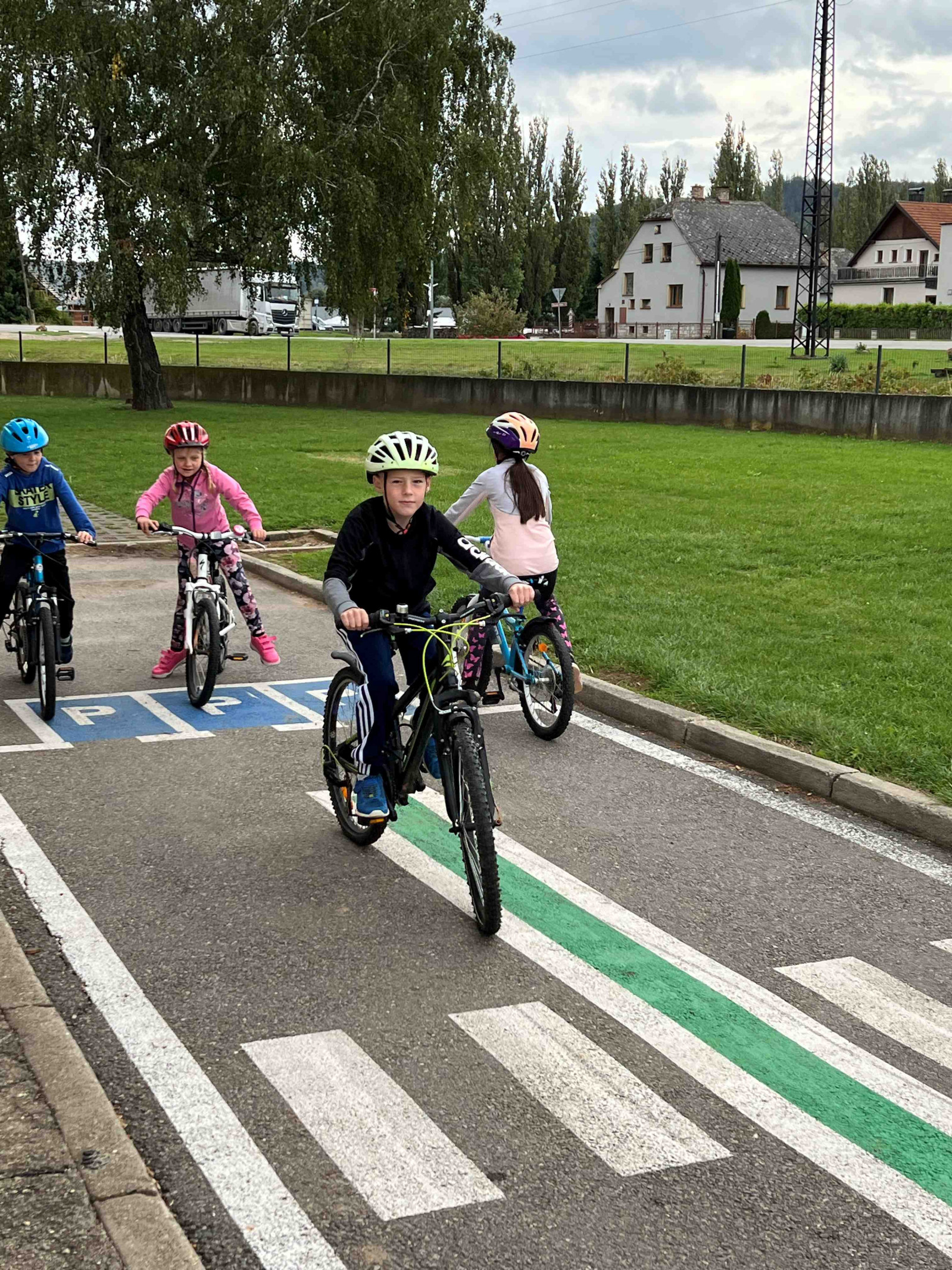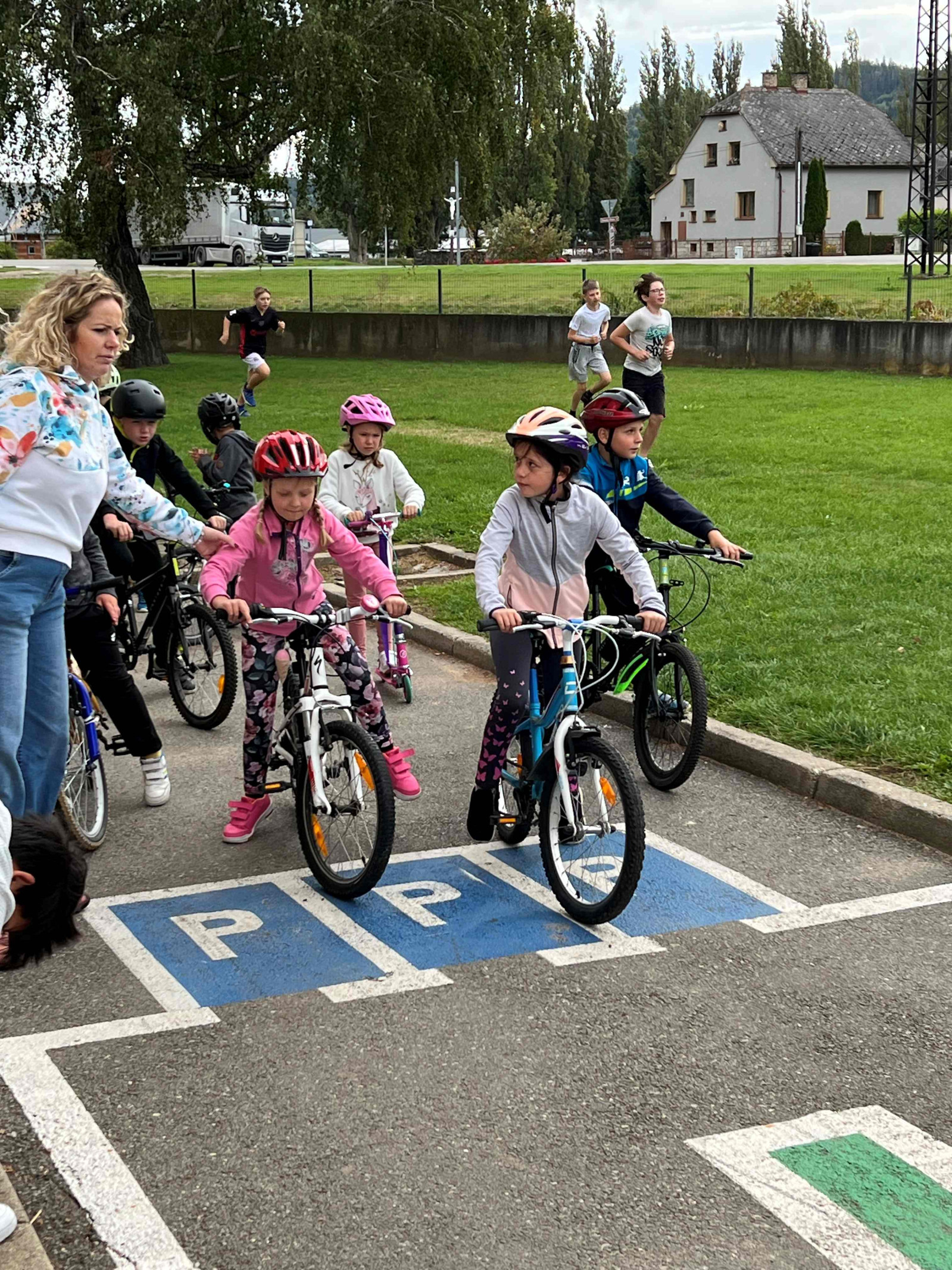 Ve druhé části si děti mohly nové poznatky vyzkoušet v praxi. Na dopravním hřišti dětem pomáhala nejen paní učitelka Chvostová, ale i šikovní dopravní asistenti ze 7. třídy. Dohlíželi a ochotně pomáhali, aby jízda na kole nebo koloběžce proběhla bezpečně a s úsměvem.