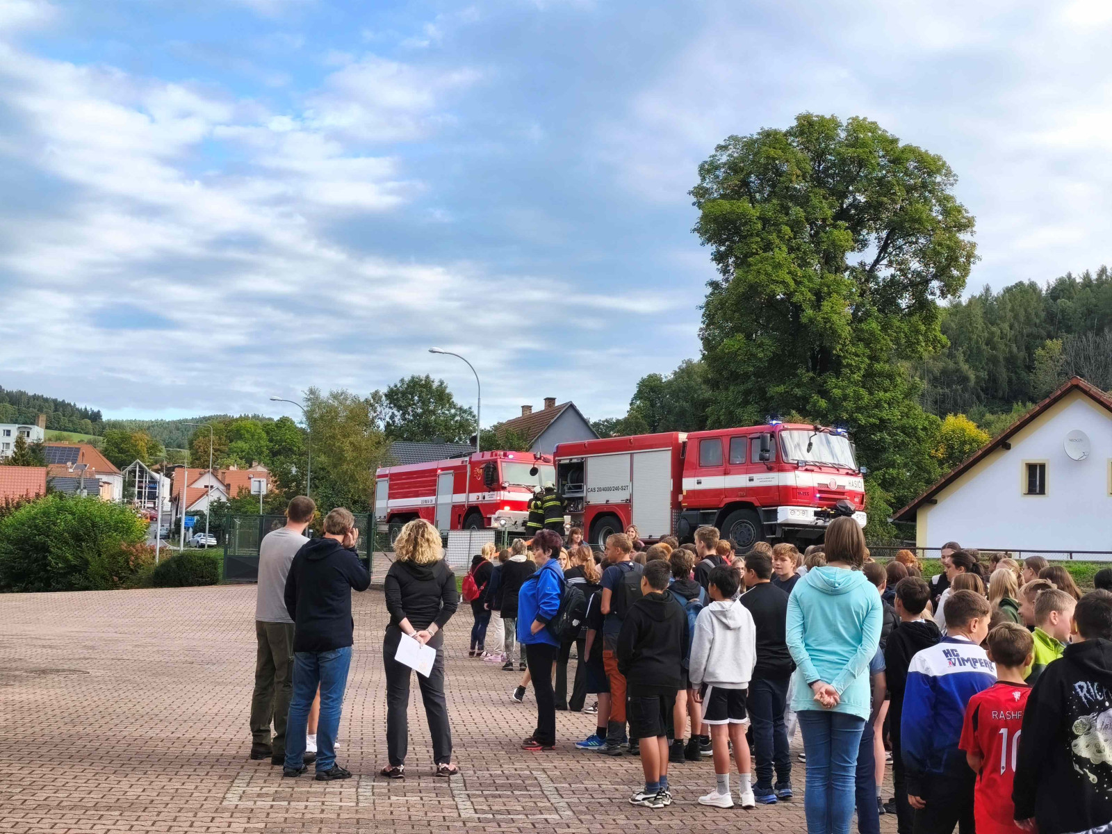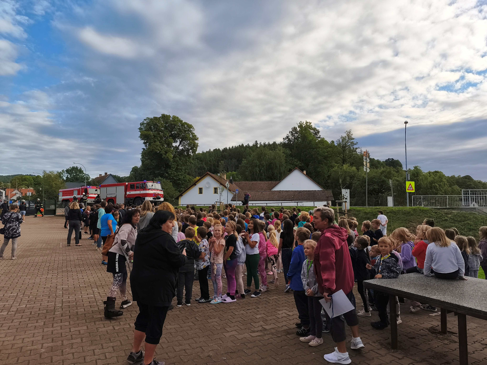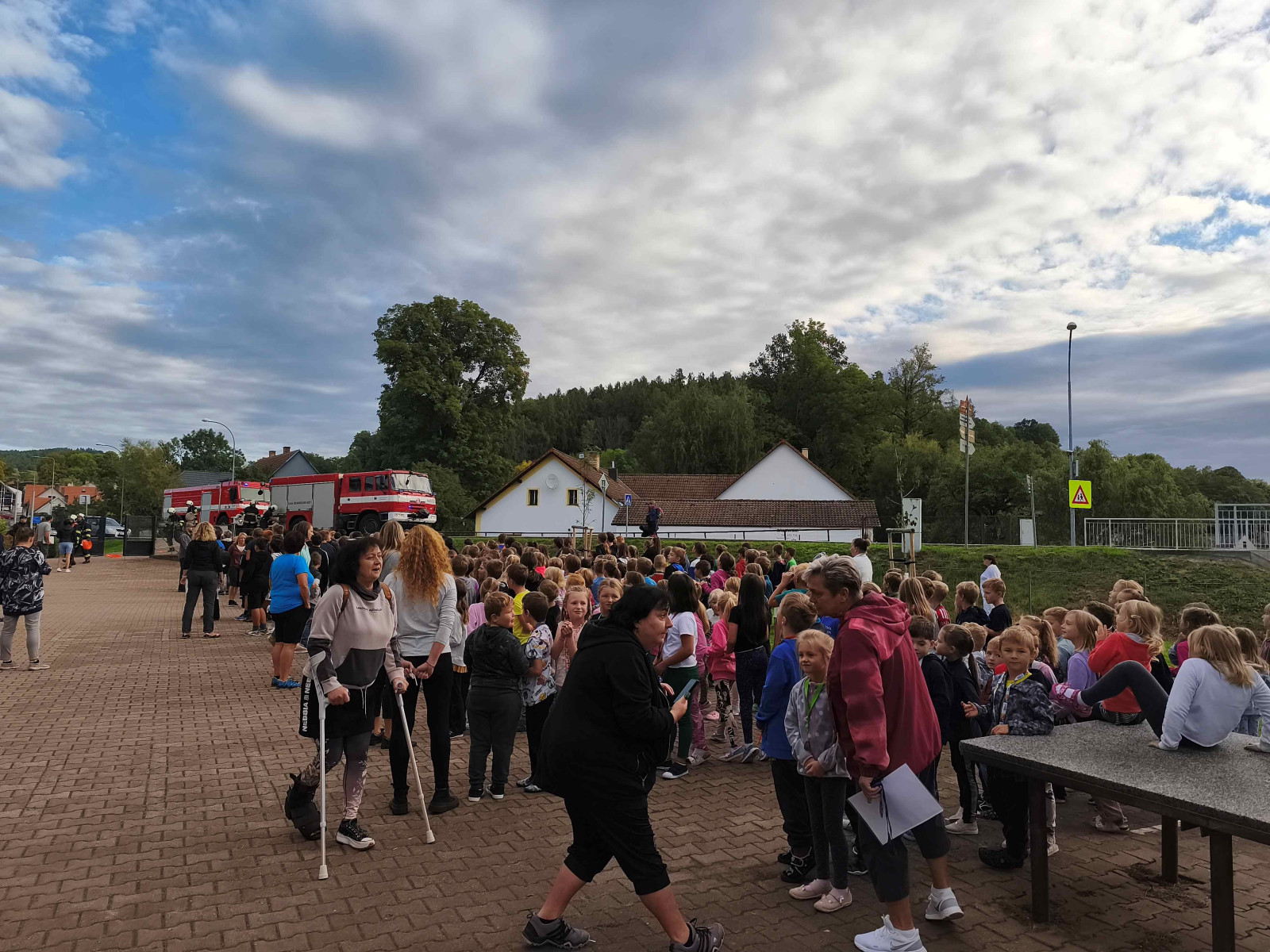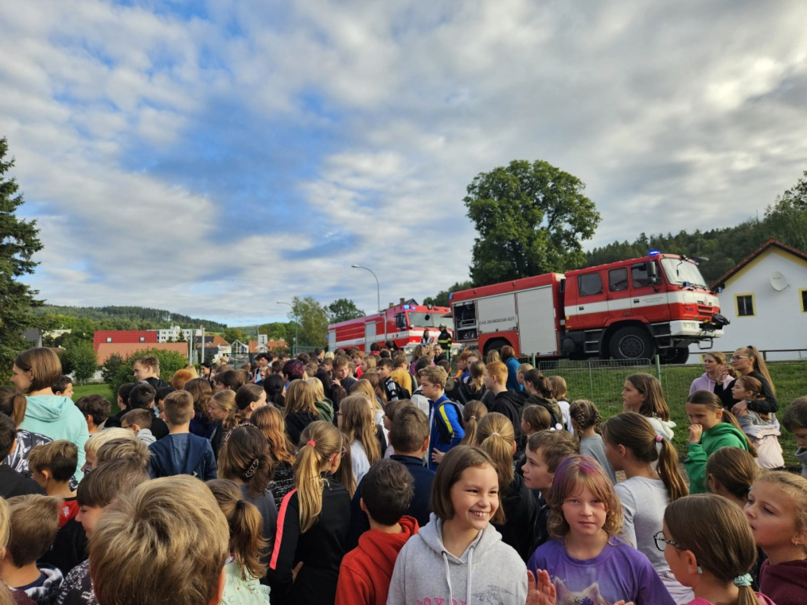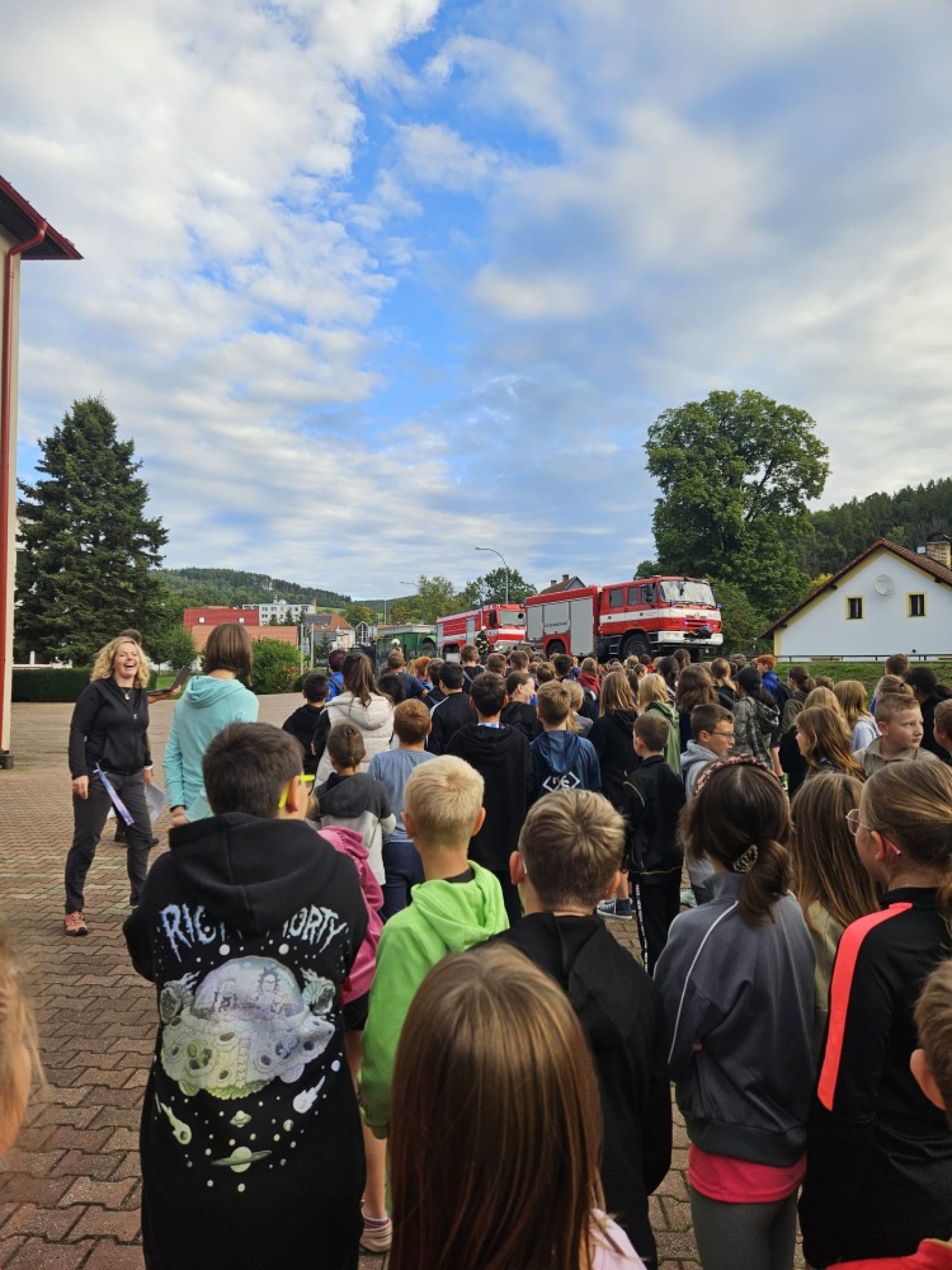 „Poplach! Všichni opusťte budovu školy!“ ozvalo se ze školního rozhlasu. Tak začalo vyučování ve čtvrtek 18. září. Celá škola zahájila projektový den s Integrovaným záchranným systémem. 30 zaměstnanců a 270 dětí školy se shromáždilo před školou a ze školního dvoru sledovali cvičný zásah profesionálních hasičů HZS Vimperk. Aby bylo vše autentické, hasiči zakouřili celý pavilon II. stupně, abychom si evakuaci mohli vyzkoušet i v podmínkách, kdy jsou chodby plné kouře a není vidět na krok.