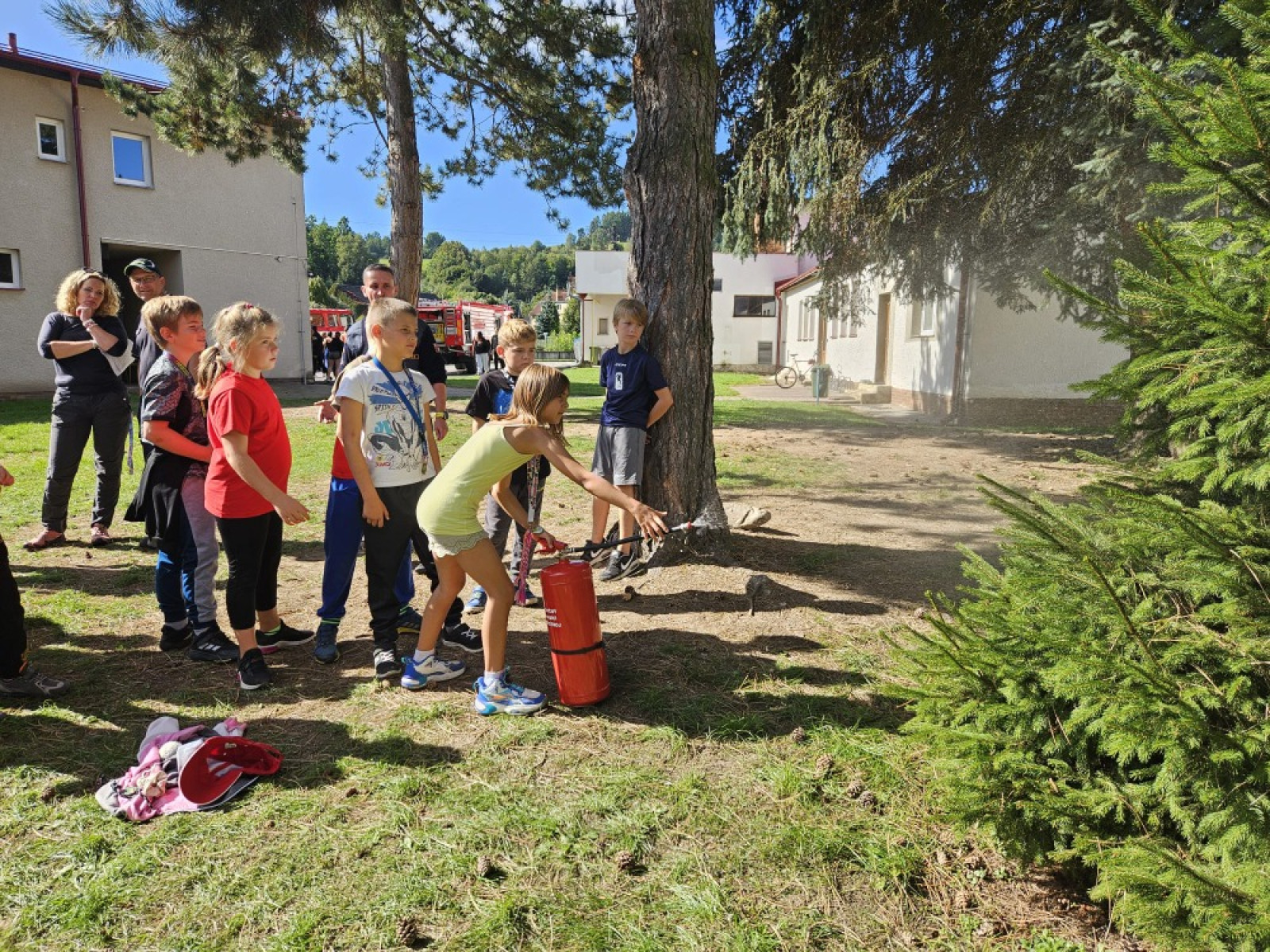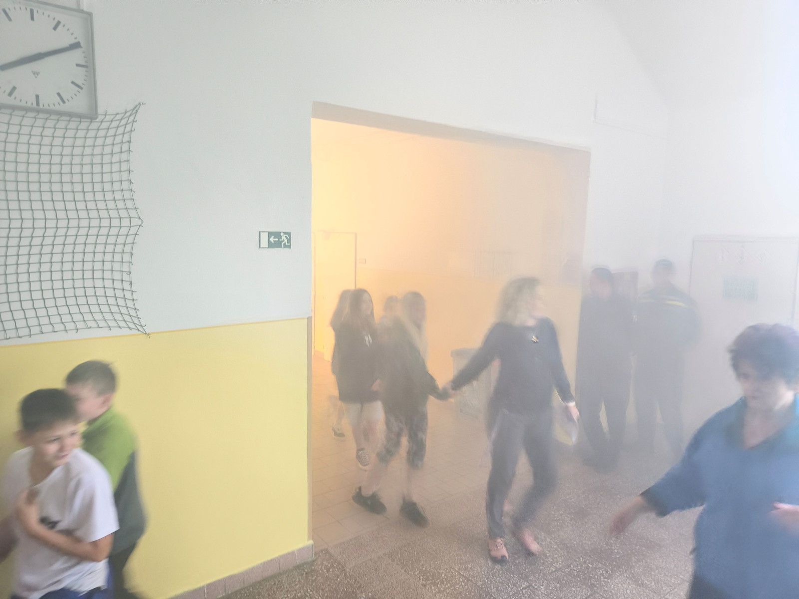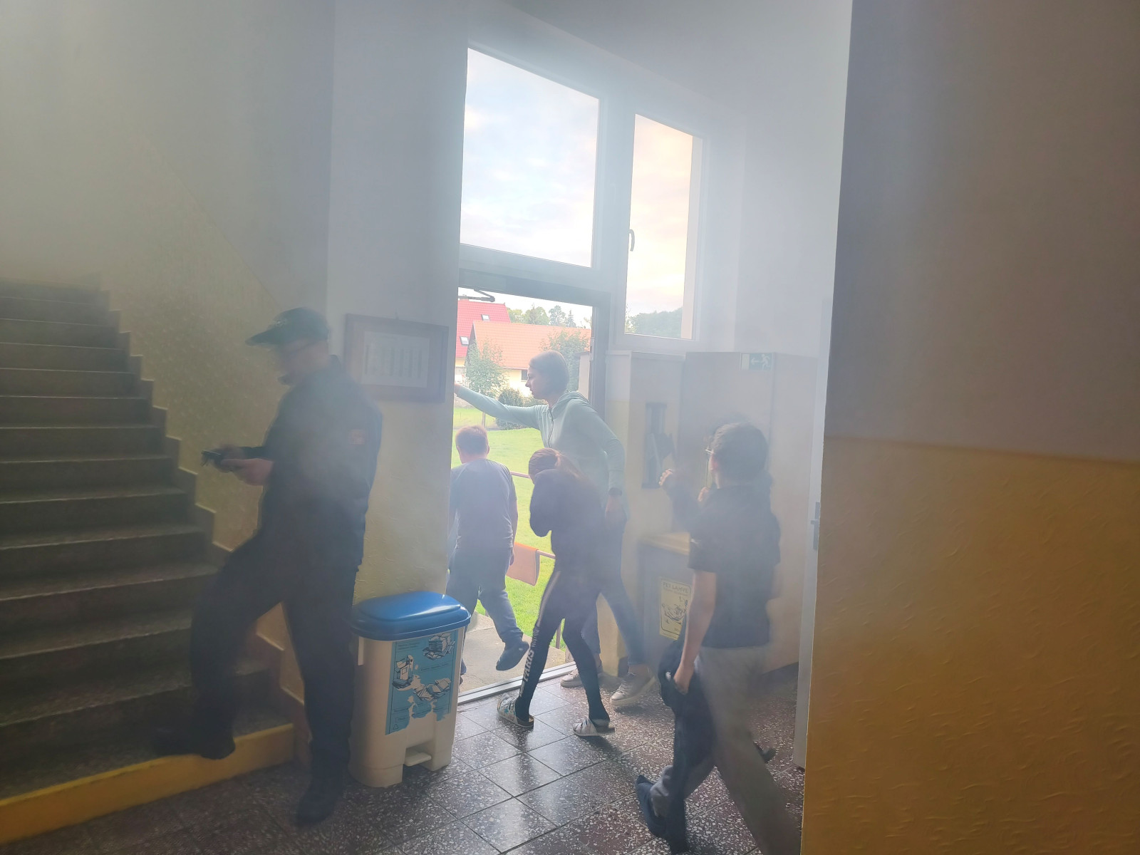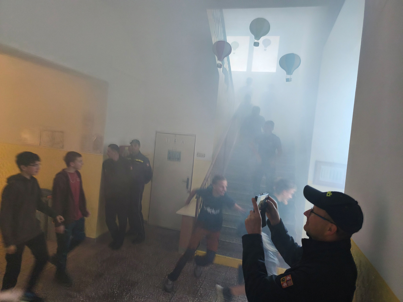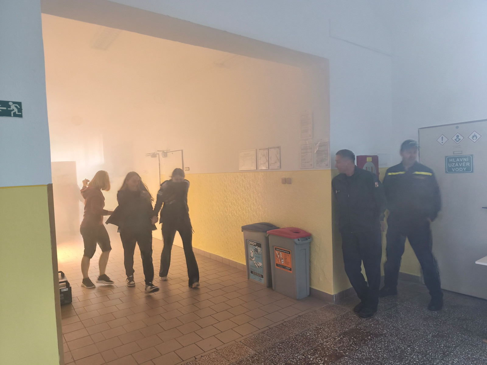 „Poplach! Všichni opusťte budovu školy!“ ozvalo se ze školního rozhlasu. Tak začalo vyučování ve čtvrtek 18. září. Celá škola zahájila projektový den s Integrovaným záchranným systémem. 30 zaměstnanců a 270 dětí školy se shromáždilo před školou a ze školního dvoru sledovali cvičný zásah profesionálních hasičů HZS Vimperk. Aby bylo vše autentické, hasiči zakouřili celý pavilon II. stupně, abychom si evakuaci mohli vyzkoušet i v podmínkách, kdy jsou chodby plné kouře a není vidět na krok.