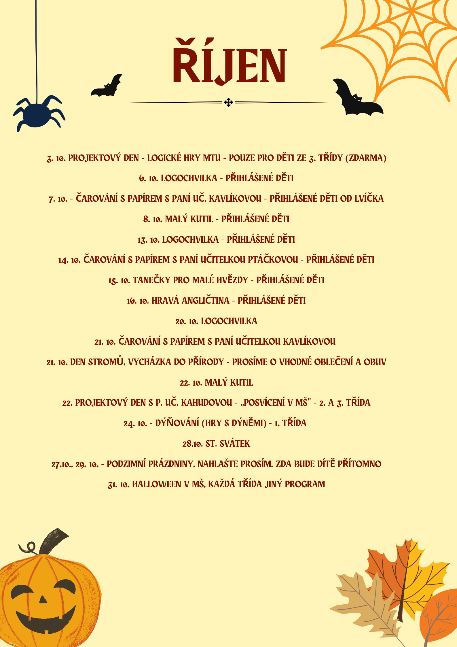 Seznámíme děti nutností chránit si své zdraví v souvislosti s počasím. Oslavíme s dětmi Halloween, budeme si povídat o tom, proč se slaví Dušičky.